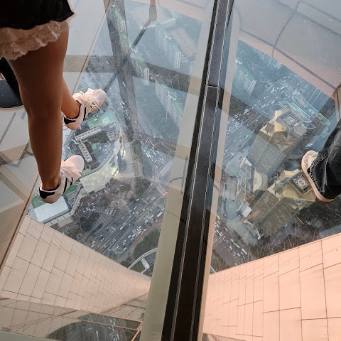 서울 시내 위 120층 유리 바닥에 섰을 때, 제가 경험한 것 중 가장 무서웠어요. 120층을 순식간에 올라간 엘리베이터에서 내리자마자, 와.