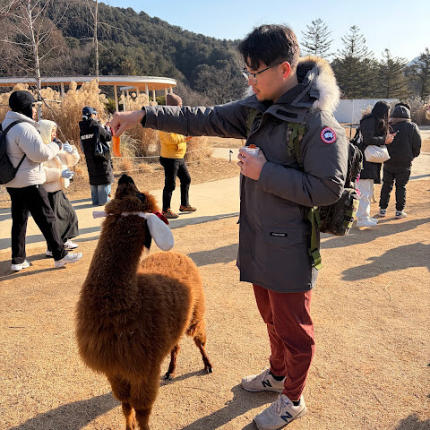 나미 투어의 깜짝 하이라이트였어요! 야생에서 뛰어다니는 알파카들을 만지고 먹이도 줄 수 있었는데, 정말 귀여웠어요! 게다가 연말 분위기에 맞춰 예쁘게 차려입고 있더라고요. 서울에서 했던 활동 중에 제일 귀여웠어요!