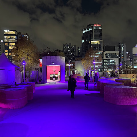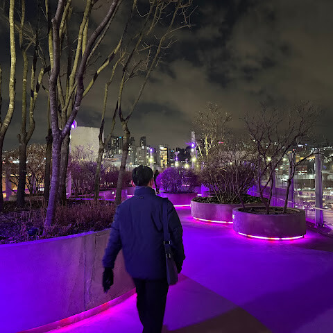 서울의 한복판, 고층 빌딩과 네온사인의 숲 속을 가로지르는 서울로7017에 겨울의 차분한 공기가 가득했습니다. 어둠이 내려앉고 도시의 불빛들이 하나둘 켜지는 그 순간, 이곳은 또 다른 세상이 됩니다.