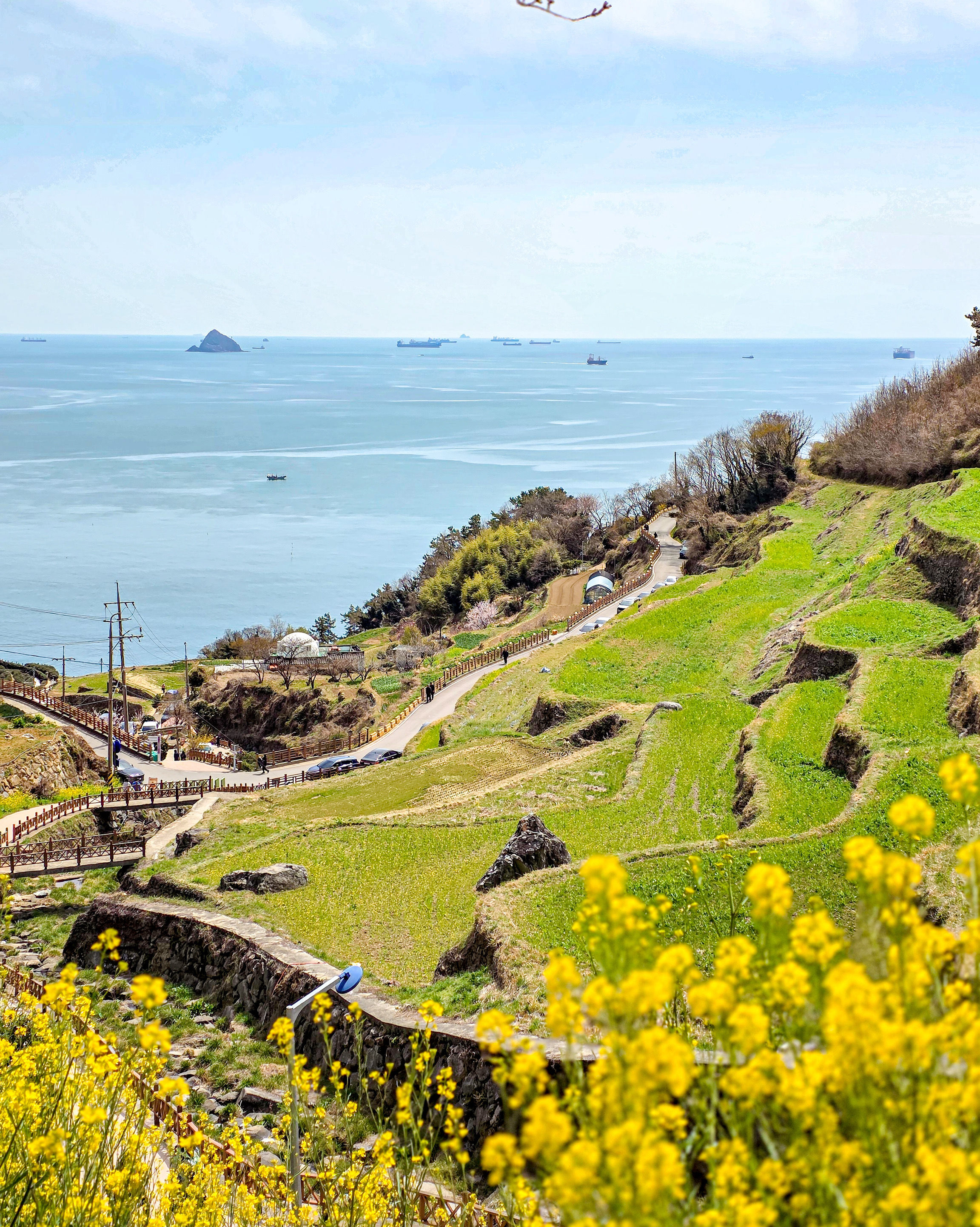 유채꽃이 만발하면 지상낙원처럼 아름다운 마을인 다랭이마을. 3월말인데도 아직 만개하지 않아 아쉬웠지만, 그럼에도 불구하고 남해바다의 장관은 볼 수있어서 감동이고 행복한곳이예요.