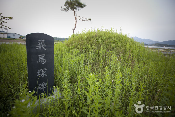 임진왜란 때 유팽로 장군은 성균관 학유로 재임하다 낙향하여 곡성, 담양, 순창에서 의병을 모아 양대박, 안영 등과 함께 담양에 모여 고경명을 의병장으로 추대하고 근왕 의병활동 중 왜군을 맞아 싸우다가 1592년 7월 10일 금산전투에서 순절하였다. 이에 장군의 충마가 장군의 머리를 물고 3백리 밤길을 달려 장군의 생가인 합강리에 나타나 부인에게 건네주고 울부 짖다 죽자 부인 원주 김씨와 마을 사람들이 충마의 갸륵한 뜻을 기리기 위해 마을 앞 송전리에 말 무덤을 만들어 주고 의마총이라 이름하여 오늘에 이르고 있다. 옥과면 합강리에는 장군과 부인 원주 김씨의 열행을 기리기 위한 정열각이 있다. |