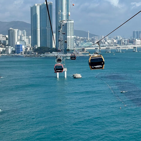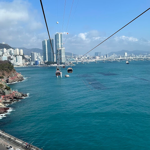 케이블카 탑승 자체는 정말 아름다웠습니다. 부산 해변과 바다 위를 미끄러지듯 지나가면서 멋진 경치를 감상할 수 있었습니다. 하지만 한 가지 주의할 점이 있습니다. 고소공포증이 있다면 추천하지 않습니다. 지상과 바다 위 30~40미터 높이에 있기 때문에 확실히 높이를 느낄 수 있습니다.