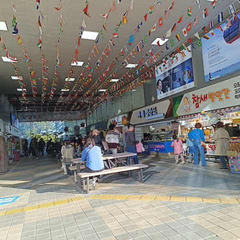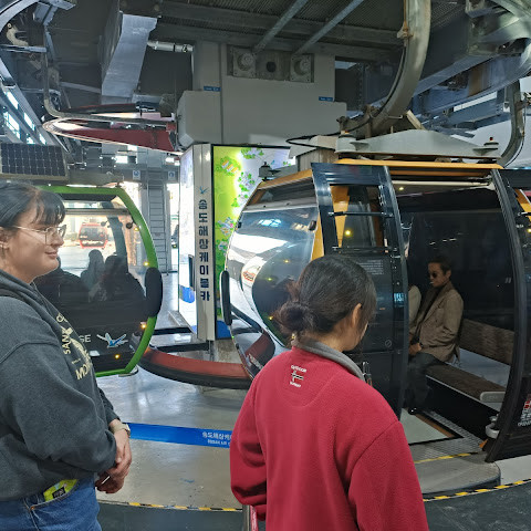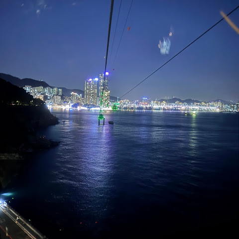 아쉽게도 저녁에 탔어요. 추가금액 지불하고 케이블카 바닥이 투명인 크리스탈 케이블카 탔는데 후회했어요. 앞 일정이 늦어져서 어두워진 다음에 탔는데 어두울때 타면 바다가 하나도 보이지 않아서 투명바닥 크리스탈 케이블카 의미 없어요. 비용만 더 지불했네요 ㅠㅠ 야경이라도 예뻤으면 했는데 감탄절로 나오는 특별한 야경은 아니었어요. 공원은 정말 넓은데 조명이 잘 되어있지 않아서 해진다음 둘러보는 것은 큰 의미 없고 또 가을밤이라  모기 많이물렸어요. 다음에는 기회가 된다면 꼭 맑은날 환한 낮에 다시 타볼래요. 또 아쉬웠던 점은 1층에서 아이스크림 갖고 타도 된다 안내 받아서 아이스크림 사서 2층 탑승하러 올라갔더니 탑승 직전에 직원이 아이스크림 안된다해서 아까운 뵈르뵈르 아이스크림 버렸어요ㅠ 안내 정확히 해주세요