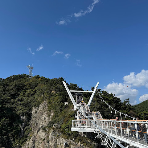 룩에서 티켓을 사는 게 더 저렴해요. 1층에서 티켓을 교환한 후 케이블카 탑승장인 4층으로 올라가는 엘리베이터를 타면 돼요. 수정처럼 맑은 케이블카 내부는 정말 아름다워요. 케이블카 안에는 에어컨이 없지만, 근처에 선풍기가 있어서 더 따뜻하게 보낼 수 있어요. 케이블카를 탄 후에는 좀 지루할 수 있어요. 바로 앞에 상점들이 즐비한 거리가 있어요. 저희는 저녁 9시쯤 갔는데 바람이 많이 불어서 아직 문을 닫은 가게들이 많았어요. 저희는 어묵과 국수 한 그릇을 2,000원에 먹었어요. 피톤치드에 관심 있다면 건산 산책로를 추천합니다. 산책하고 사진도 찍고 다시 돌아오는 코스로 추천합니다.