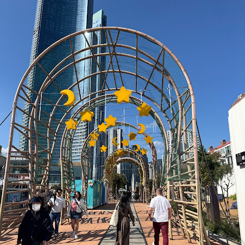 이 여정은 그 자체로 목적지가 되는, 상류역에 있는 송도 스카이파크로 이어집니다. 아름다운 전망대, 재미있는 사진 촬영 장소(공룡 공원 포함), 그리고 아름다운 산책로가 있습니다.