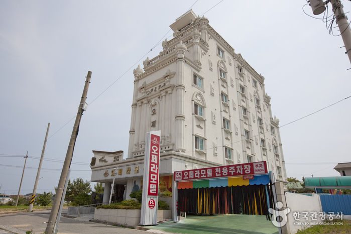 오페라모텔은 돌산대교를 건너 여수 제3 청사 근처에 위치한다. 건물의 외관은 흡사 중세 유럽의 건축물처럼 웅장하고 화려하게 되어 있어, 지나는 이들이 한 번쯤 돌아볼 만하다. 객실은 모두 화려한 색감이 돋보이는 인테리어로 꾸며져 있고, 특히 침대머리 부분을 빌로드 느낌으로 꾸민 벽이 인상적이다. 세련된 인테리어 감각이 돋보이는 특실은 침실과 거실을 시각적으로 분리하는 나무 기둥이 있어 한층 돋보인다.