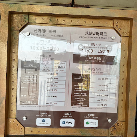 입구 왼쪽에 "한복 대여"가 있습니다. 옷은 새것입니다. 남녀 직원이 한복 맞추는 것을 도와줍니다. 여성분들은 헤어와 액세서리를 도와줄 수 있습니다. 여성분들은 가방을, 남성분들은 쿠사 모자를 써볼 수 있습니다. 갈아입을 신발도 있지만, 투어에 포함되어 있어서 갈아입는 사람이 거의 없습니다. 직원들은 매우 친절하고 옷 입는 것을 도와줍니다. 비 오는 날은 정말 끔찍합니다. 많은 시설이 문을 닫았는데, 안타깝고 어이가 없습니다. 다행히 투어에 세 가지 품목 티켓이 포함되어 있어서 세 가지를 모두 즐길 수 있었습니다. 귀여운 동물들과 교감할 수 있는 공간도 있지만 추가 요금이 있습니다. 공원은 작아서 금방 둘러볼 수 있습니다. 오후 9시 10분에 5분짜리 불꽃놀이가 있습니다. 안에 식당이 있지만 저는 거기서 식사를 하지 못했습니다.