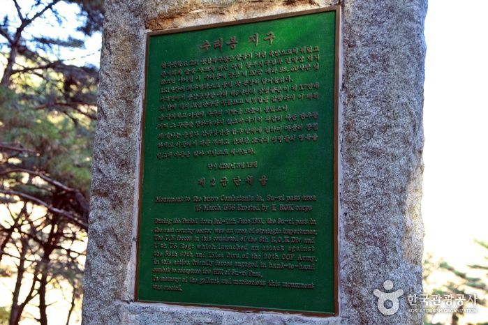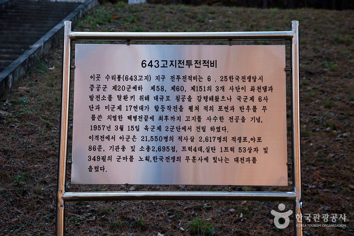 643고지 전투 전적비는 평화의 댐으로 가는 길에 있다. 한국전쟁 당시 수리봉 643고지를 중공군 제20군과 싸웠던 국군 제6사단과 미군 17연대의 전공을 기념하기 위해 세운 것이 바로 643고지 전투 전적비다. 백병전 끝에 적을 물리치고 사수한 전과를 길이 남기고 이 전투에서 산화한 장병들을 추모하기 위해 건립했다.