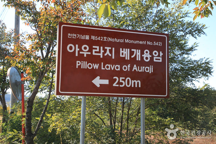 베개용암은 그 모양이 마치 둥근 베개 모양 같다고 하여 붙여진 이름이며, 아우라지는 두 갈래 이상의 물길이 한데 모이는 어귀를 뜻한다. 아우라지 베개용암은 고온의 용암이 흐르다가 찬물(영평천)을 만나 급속하게 식으면서 굳어진 암석이다. 베개용암은 육지에서 발견되는 경우가 드물며, 대부분 물이 풍부한 바다 속에서 형성된다.