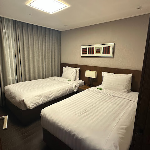침실 2개와 욕실 2개, 완비된 주방을 갖춘 프리미어 스위트룸입니다. 직원분들이 친절하고 따뜻하게 맞아주셨습니다. 매우 넓고 편안한 객실이었고, 명동까지 걸어서 30분이면 갈 수 있는 거리입니다. 이번이 두 번째 숙박인데, 역시 최고였습니다. 오전 11시와 오후 2시에 인근 관광지로 가는 셔틀 서비스가 운행됩니다. 호텔 로비에 커피빈앤티리프가 있고, 근처에 편의점도 있습니다.