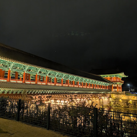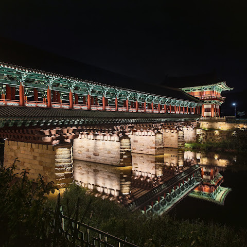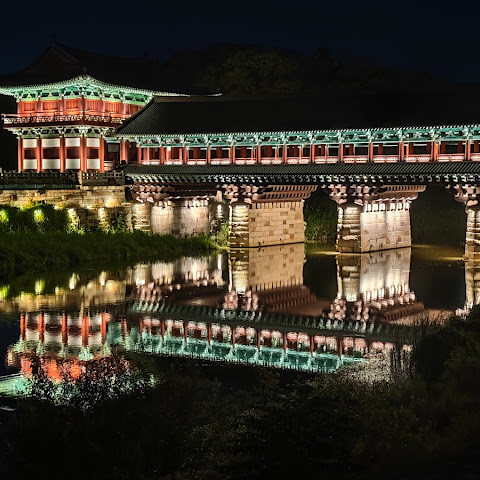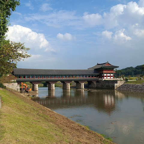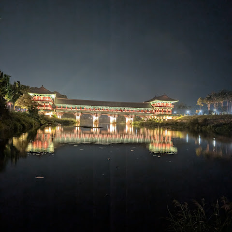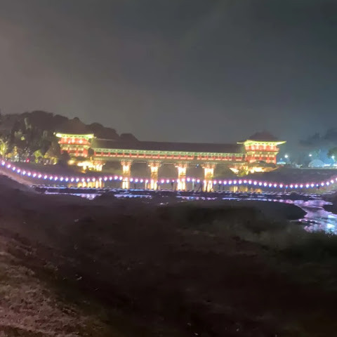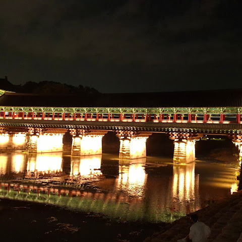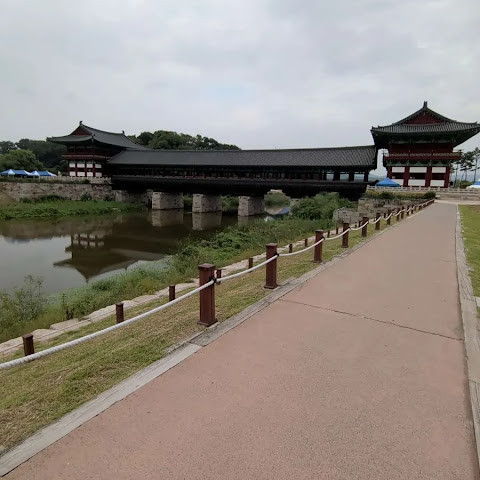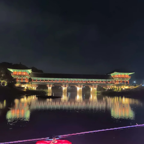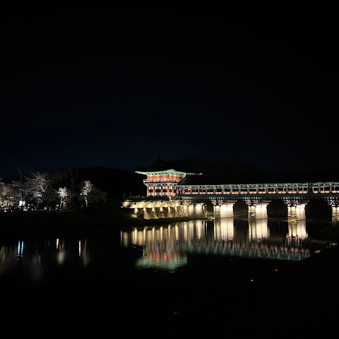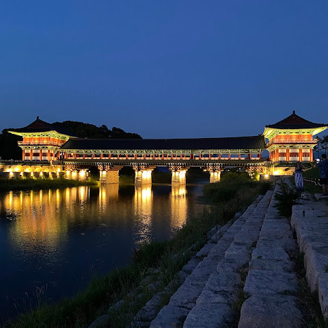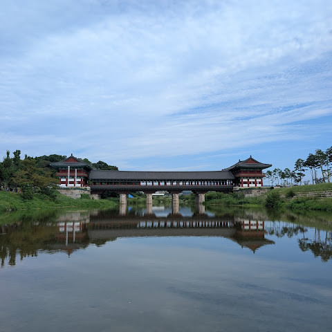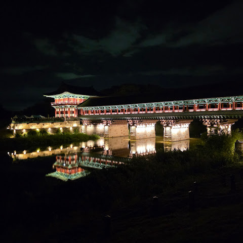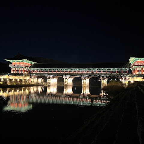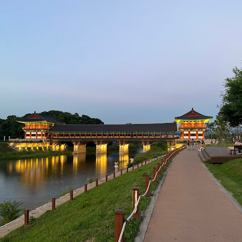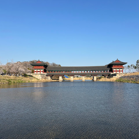 첨성대가 있는 공원 앞에 위치하는 훌륭한 문구가 인상적인 목조 다리. 무료로 다닐 수 있습니다. 가까이서 보면 정교한 제작과 아름다운 조각이 베풀어져 있어 의외로 보이지만 20분이면 충분합니다. 경주의 다른 관광지와 비교하면 사람이 적고 천천히 걸어 다닐 수 있습니다. 밤이 되면 라이트 업되어 낮과는 또 다른 환상적인 분위기를 즐길 수 있습니다. 근처에서 봐도 멀리서 봐도 매우 깨끗하고, 밤의 산책에 딱 맞는 장소입니다.