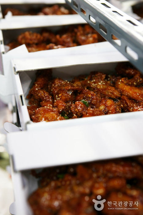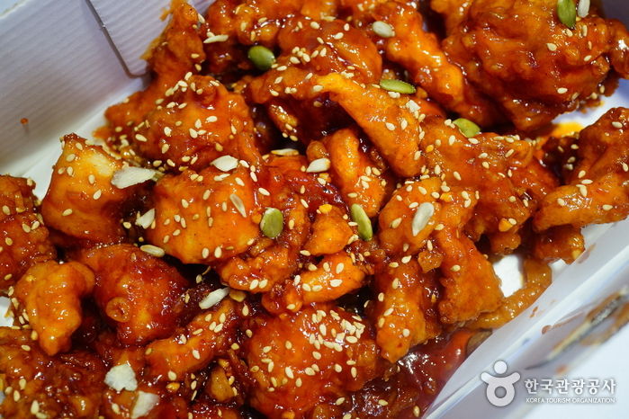 예로부터 양계장이 많았던 강원도에서 매콤달콤한 닭강정은 춘천 닭갈비와 함께 지역 관광의 필수 먹거리로 자리 잡은 지 오래다. 바삭하게 튀긴 닭고기에 조청과 청양고추로 만든 소스로 버무린 닭강정은 식어도 파삭파삭해 오래 보관할 수 있고 특유의 고기냄새가 나지 않아 남녀노소 누구에게나 인기이다. 속초 관광수산시장은 이름에 걸맞게 먹거리가 풍성한 곳이다. 특히 열 개가 넘는 닭강정 점포가 밀집한 닭강정 골목은 주말과 휴일이면 강원 도민은 물론 각지에서 몰려온 관광객들로 인산인해를 이룬다. 속초 관광수산시장 닭강정골목은 전국 단위로 명성을 얻고 있는 맛집이 두 곳이나 있는 등 모든 점포가 저마다 특유의 비법으로 닭강정 맛을 뽐내 그 맛을 비교해 보는 재미도 있다.