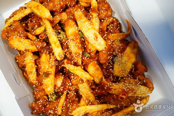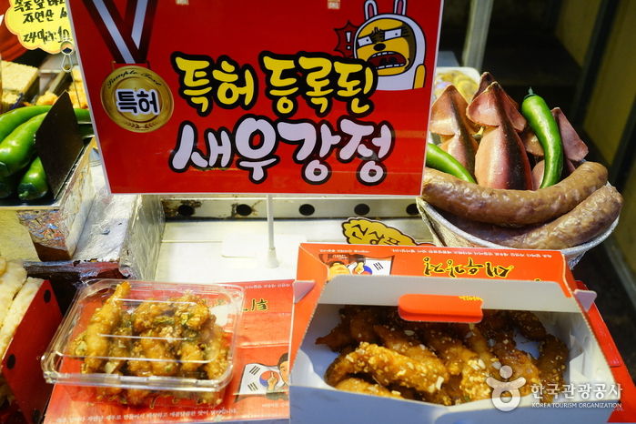 예로부터 양계장이 많았던 강원도에서 매콤달콤한 닭강정은 춘천 닭갈비와 함께 지역 관광의 필수 먹거리로 자리 잡은 지 오래다. 바삭하게 튀긴 닭고기에 조청과 청양고추로 만든 소스로 버무린 닭강정은 식어도 파삭파삭해 오래 보관할 수 있고 특유의 고기냄새가 나지 않아 남녀노소 누구에게나 인기이다. 속초 관광수산시장은 이름에 걸맞게 먹거리가 풍성한 곳이다. 특히 열 개가 넘는 닭강정 점포가 밀집한 닭강정 골목은 주말과 휴일이면 강원 도민은 물론 각지에서 몰려온 관광객들로 인산인해를 이룬다. 속초 관광수산시장 닭강정골목은 전국 단위로 명성을 얻고 있는 맛집이 두 곳이나 있는 등 모든 점포가 저마다 특유의 비법으로 닭강정 맛을 뽐내 그 맛을 비교해 보는 재미도 있다.