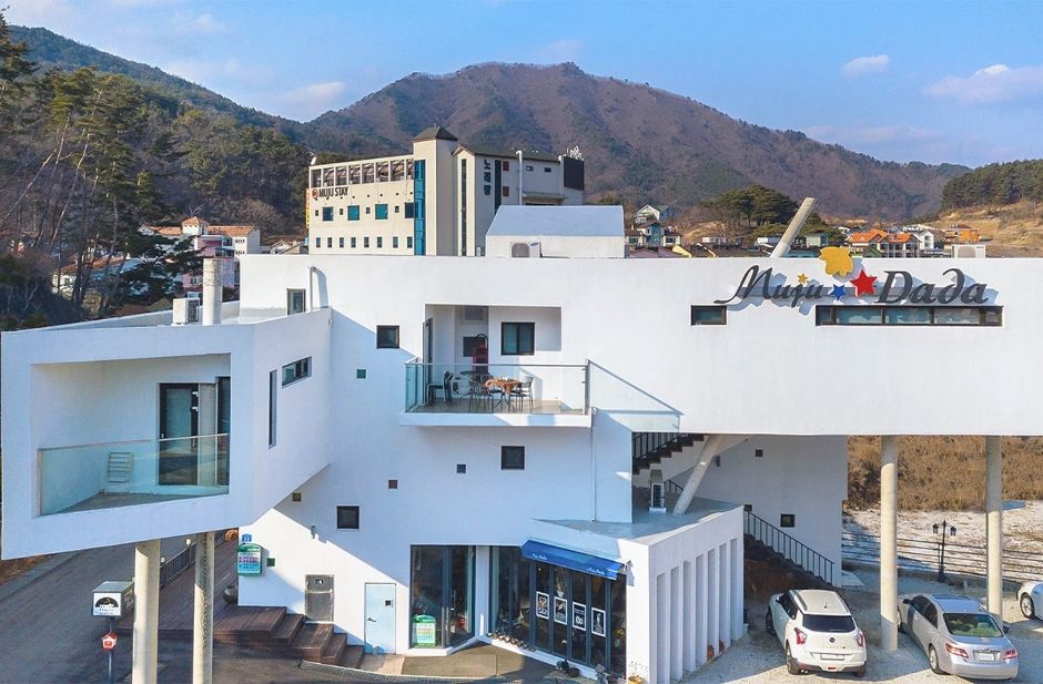 무주구천동 랜드마크 다다펜션은 전북 건축문화상 대상을 받은 독특한 분위기를 풍기는 하얀색 외관의 숙소다. 총 7개의 객실로 단층, 복층, 다락방 형태 등으로 구성되어 취향에 따라 선택할 수 있다. 아기자기한 도자기 소품들로 가득한 1층 갤러디 다다카페에서는 주인장이 내어주는 모닝차를 맛볼 수 있다. 무주리조트와 덕유산 자연휴향림이 10분 이내 거리에 있고, 펜션 바로 근처에 편의점이랑 농협하나로마트가 있다.