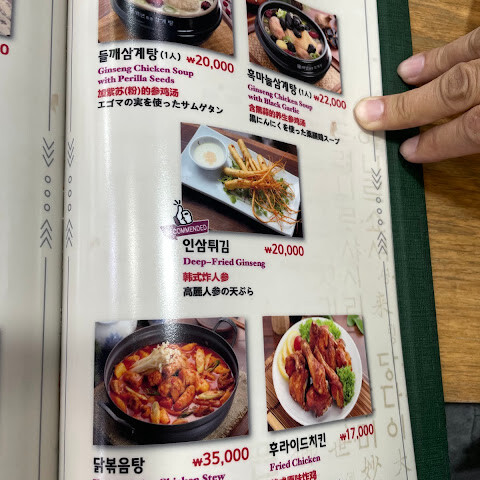 일반 인삼닭은 인삼 맛이 전혀 안 나고, 전복이 들어간 야생 인삼닭이 더 낫습니다. 하지만 둘 다 닭고기가 너무 질겨요. 후라이드 치킨은 부드럽고 낫지만 맛은 별로 없네요 😵😵‍💫