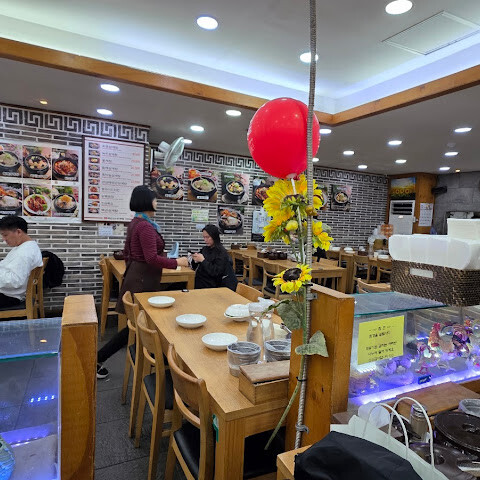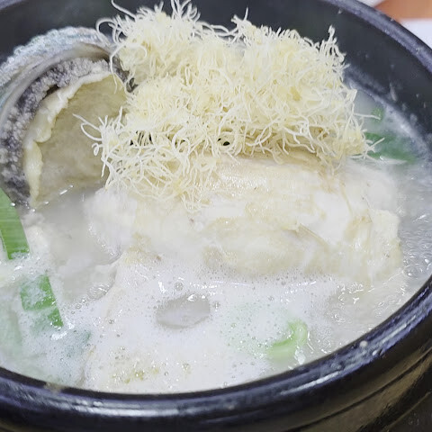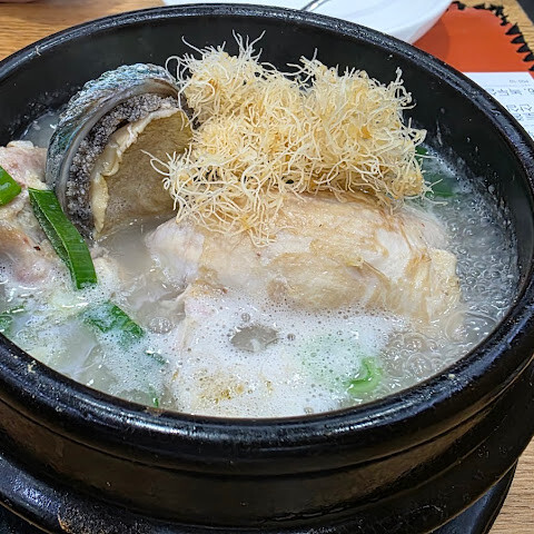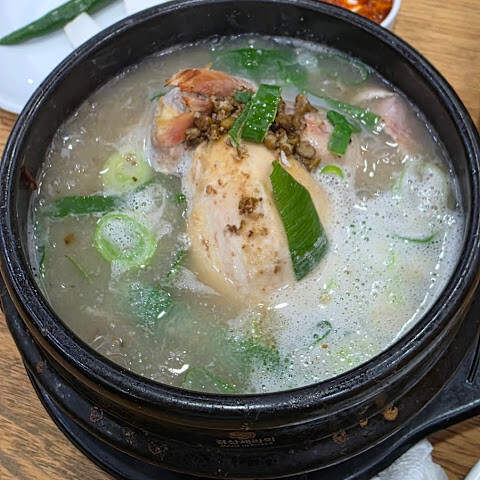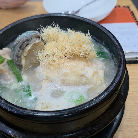 한국 여행에서 인삼닭국을 빼놓을 수 없죠! 미슐랭 스타 레스토랑이라는 걸 입구에 들어서자마자 알았어요. 붐볐지만 (대부분 단체 관광객이었어요), 자리는 넉넉했고 직원들은 정말 효율적이었어요. 닭국에 들어간 찹쌀밥은 정말 맛있었고, 닭고기는 정말 부드러웠어요 (전복까지 들어 있었는데, 꽤 드문 일이죠). 개인적으로 대추는 별로였어요… 마시고 나니 몸이 따뜻해졌어요. 사이드 메뉴로 나온 무는 정말 맛있었는데, 혹시 맛이 부족하다 싶으면 김치를 더 넣으세요.