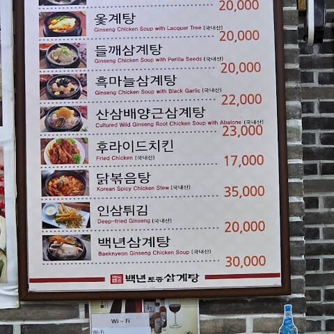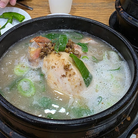한국 여행에서 인삼닭국은 빼놓을 수 없죠! 입구에 들어서자마자 미슐랭 스타 레스토랑이라는 걸 알았어요. 붐볐지만 (대부분 단체 관광객이었어요), 자리는 넉넉했고 직원들은 정말 효율적이었어요. 닭국에 들어간 찹쌀밥은 정말 맛있었고, 닭고기는 부드럽고 완벽하게 익었어요 (전복까지 들어 있었는데, 꽤 드문 일이죠). 개인적으로 대추는 별로였어요… 마시고 나니 몸이 따뜻해졌어요. 사이드 메뉴로 나온 무는 정말 맛있었는데, 혹시 맛이 부족하다 싶으면 김치를 더 넣으세요.