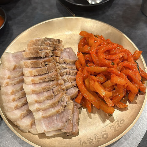 보쌈(삶은 돼지고기) 또한 훌륭한 맛을 자랑하는데, 더욱 깔끔하고 신선한 풍미를 느낄 수 있습니다. 고기는 놀라울 정도로 부드럽고, 아삭하고 상큼한 매콤한 무 샐러드와 함께 먹으면 완벽한 조화를 이룹니다. 다양한 소스와 함께 제공되어 한 입 한 입이 모두 매력적입니다. 돼지고기 요리를 좋아한다면 이 식당을 꼭 방문해 보세요.