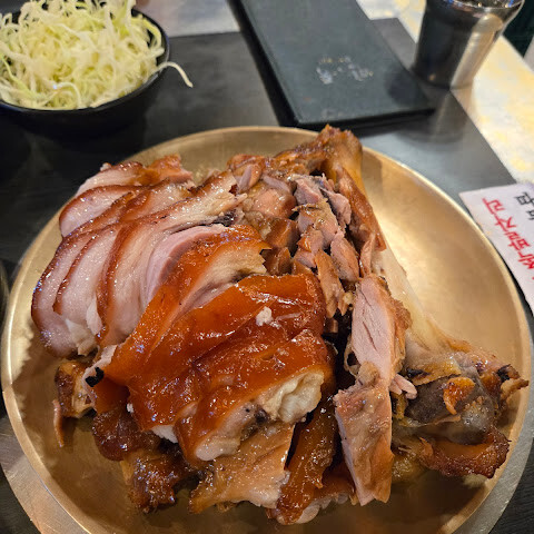 평생 먹어본 족발/돼지고기 요리 중 최고였어요. 여행 동행자들은 모두 여행이 끝난 후에도 이곳과 요리를 기억하며, 한국에 다시 방문한다면 친구들에게 꼭 추천하거나 가족들과 함께 가보라고 100% 추천하겠다고 했습니다. 지방과 고기의 비율이 적절하게 균형을 이루고 있고, 달콤하고 짭짤한 양념이 딱 맞아요. 한국어 메뉴는 모르겠지만, 영어/중국어 버전은 이제 세 가지 크기로 나오는 것 같아요.
