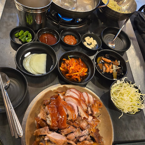 몇년전에 가보고 두번째 방문 4명이서 족발대 막국수캔사이다 5.5만원 셋트메뉴 주문 떡만두국서비스주셔서 맛나게먹었고 양배추제외하고는 반찬 셀프라 부족함없이 잘 먹었습니다 족발이 개고기수육마냥 너무 흐물흐물 녹는점이 아쉬웠지만 (저는 탱탱한게좋아요 ) 간이 적당해서 좋았습니다 식탁사이즈가 너무 작아서 편하게먹지는 못했습니다 나올때보니 대기줄이 길더군요