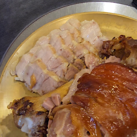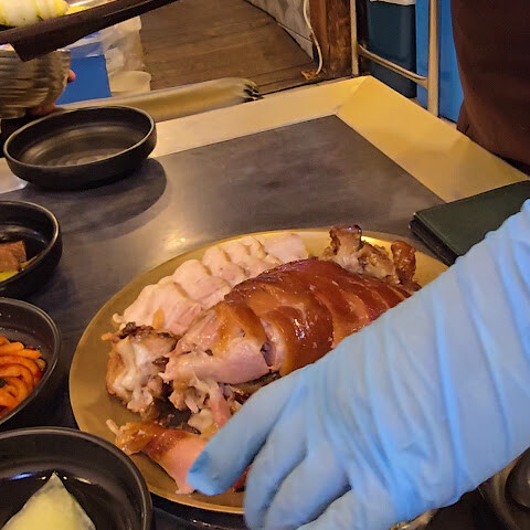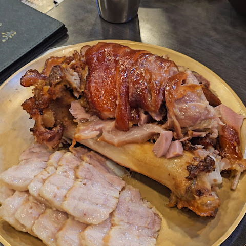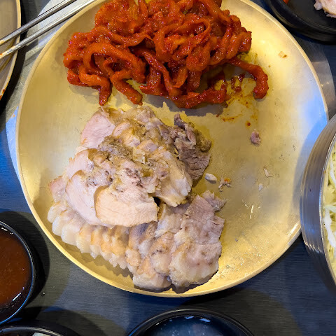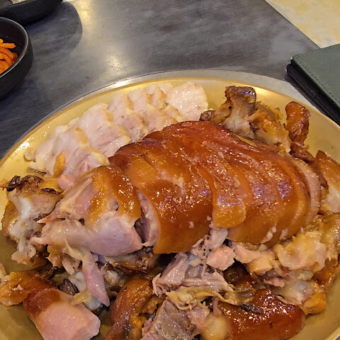 시청역 근처 골목에 자리 잡은 미슐랭 스타 한식/중식 전문점입니다. 여러 지점이 있지만, 제 시누이가 가장 좋아하는 곳입니다(시누이 추천으로). 얇게 썬 돼지 족발 한 접시를 아름답게 담아서 먹기 좋게 제공합니다. 오향으로 만든 중국식 돼지 족발을 드셔보셨다면 이곳의 고전적인 맛을 알아보실 겁니다. 얇게 썬 고기 조각 아래에 뼈가 파묻혀 있고, 부드럽고 입에서 살살 녹는 돼지 껍질은 훌륭한 콜라겐입니다. 냉면과 만두가 들어간 계란탕 등 다양한 반찬이 제공됩니다. 일행 수에 따라 더 적게 또는 더 많이 주문할 수 있습니다. 4명 이하가 이상적인 그룹이라고 생각합니다. 돼지고기 요리와 한식을 좋아하신다면 이곳을 추천합니다. 저희는 서울에 7일간 머무는 동안 두 번 방문했습니다. 그리고 소스가 묻은 차가운 국수를 먹기 전에 제공된 앞치마를 착용하는 것을 잊지 마세요.
