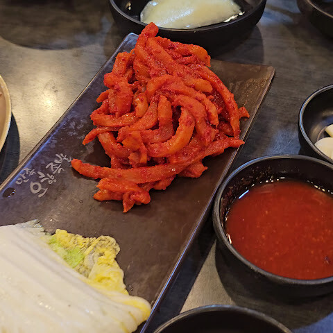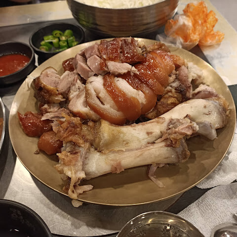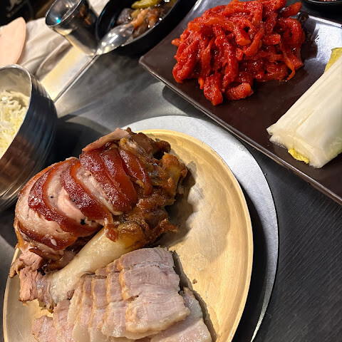 평생 먹어본 족발/돼지고기 요리 중 최고였어요. 여행 동행자들은 모두 여행이 끝난 후에도 이곳과 요리를 기억하며, 한국에 다시 방문한다면 친구들에게 꼭 추천하거나 가족들과 함께 가보라고 100% 추천하겠다고 했습니다. 지방과 고기의 비율이 적절하게 균형을 이루고 있고, 달콤하고 짭짤한 양념이 딱 맞아요. 한국어 메뉴는 모르겠지만, 영어/중국어 버전은 이제 세 가지 크기로 나오는 것 같아요.