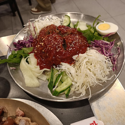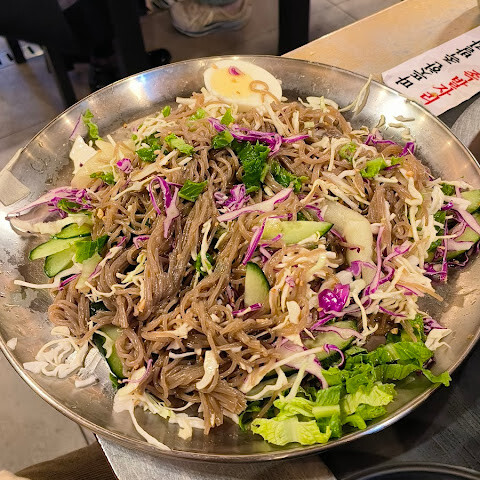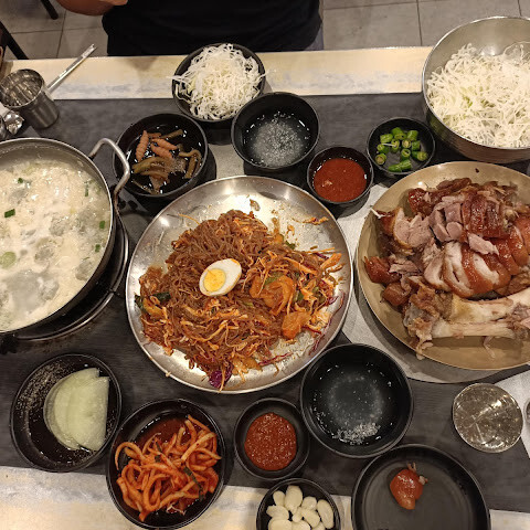 몇년전에 가보고 두번째 방문 4명이서 족발대 막국수캔사이다 5.5만원 셋트메뉴 주문 떡만두국서비스주셔서 맛나게먹었고 양배추제외하고는 반찬 셀프라 부족함없이 잘 먹었습니다 족발이 개고기수육마냥 너무 흐물흐물 녹는점이 아쉬웠지만 (저는 탱탱한게좋아요 ) 간이 적당해서 좋았습니다 식탁사이즈가 너무 작아서 편하게먹지는 못했습니다 나올때보니 대기줄이 길더군요