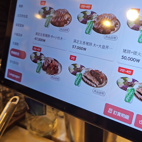 주문도 매우 편리합니다. 각 테이블에는 주문용 태블릿이 있는데, 중국어로 변경할 수 있습니다. 저희는 돼지 족발 반 마리, 고기로 감싼 야채, 냉면 한 접시, 그리고 무료 음료 한 병이 포함된 세트를 주문했습니다. 한국식 계란찜도 하나 더 주문했습니다.
