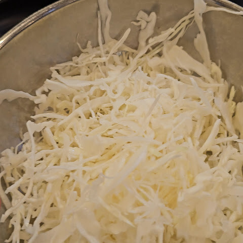 테이블에 반찬(맛있어요)이 가득하고, 만두와 떡국(맛있어요)이 있고, 큰 그릇에 생 양배추 채가 담겨 있습니다. 웨이터가 양배추를 식초와 족발과 함께 먹으라고 알려주셨어요.