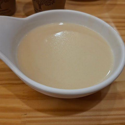 따뜻하고 고소한 국물로 식사를 시작했는데, 부드럽고 맛있었습니다. 이곳의 장점 중 하나는 국물과 샐러드를 무제한으로 리필할 수 있다는 것입니다.