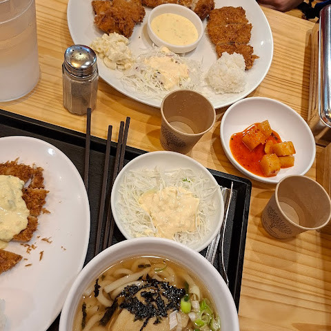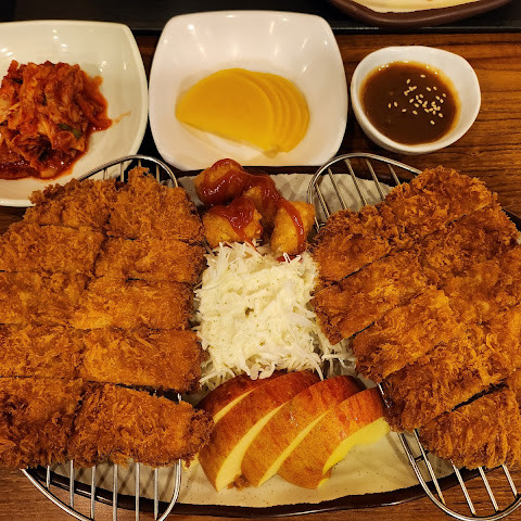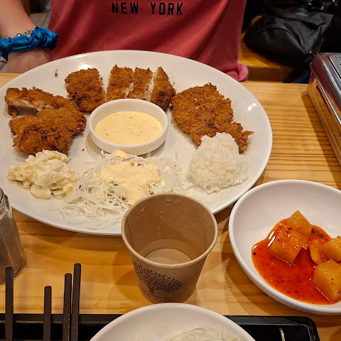 저는 클래식 킹사이즈 돈까스를 주문했고, 아내는 매콤한 쫄면과 미니 돈까스를 함께 주문했습니다. 놀랍게도 쫄면과 돈까스의 조합이 아주 잘 어울렸습니다. 돈까스는 바삭하고 양도 푸짐했으며, 깍두기와도 잘 어울렸습니다. 깍두기를 곁들인 치킨은 깍두기와 함께 먹으면 더욱 맛있다는 것을 다시 한번 느꼈습니다. 음식과 서비스 모두 만족스러웠습니다. 비교적 조용하고 사람이 많았습니다. 소규모 모임, 커플, 친구들과 함께하기에 좋은 곳이었습니다.