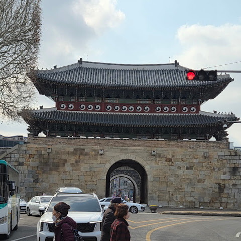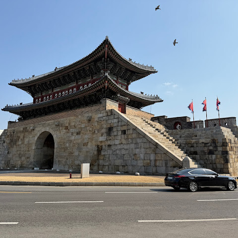 수원화성의 남문입니다. 현재는 로터리로 사용되고 있으며, 양쪽으로 주요 버스 정류장이 있습니다. 근처에는 수원화성 성벽 산책로와 함께 시장이 있습니다.