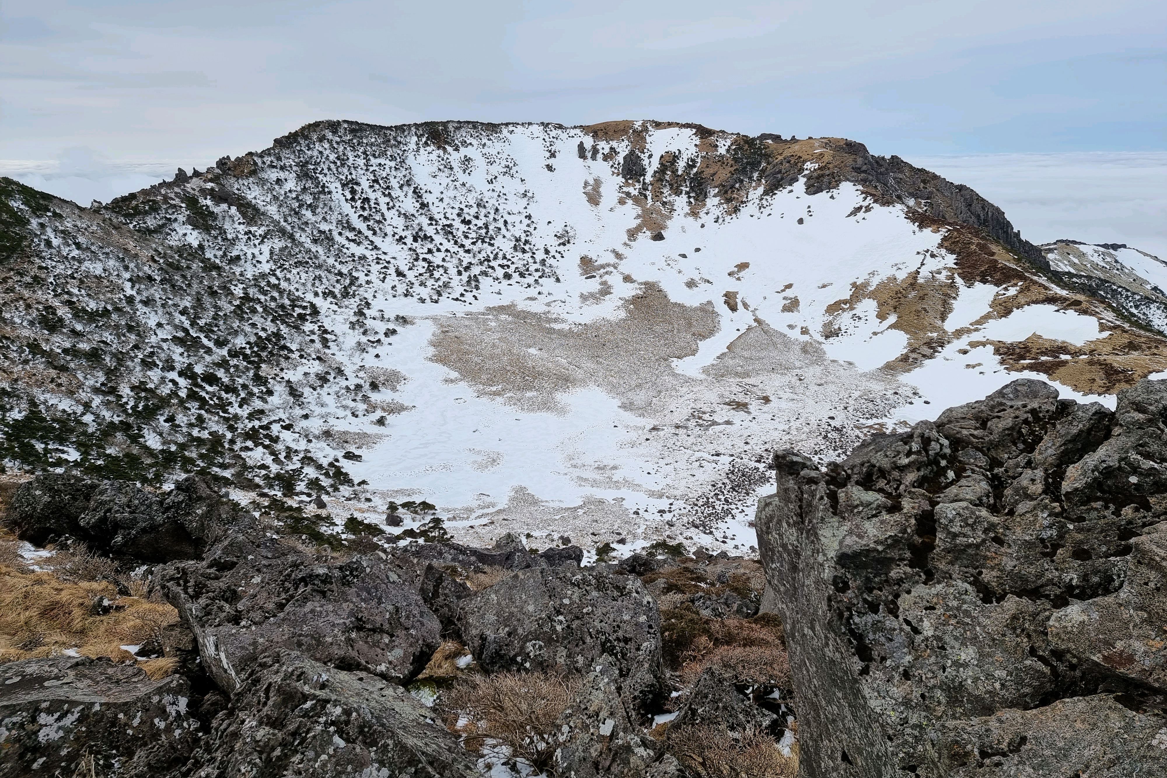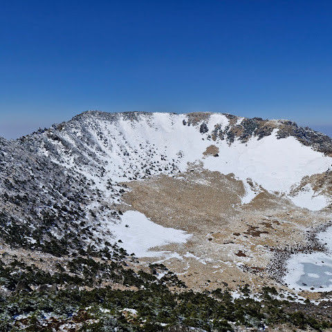 🔍등산후기: 관음사 탐방로 - 탐라계곡 - 개미목 - 삼각봉대피소 - 용진각현수교 - 왕관릉 - 백록담(정상) - 진달래밭대피소 - 사라오름입구 - 속밭대피소 - 성판악 (겨울산행으로, 왕관릉 부근 옛 용진각대피소에서 올라가는 경사도가 꽤 높음)