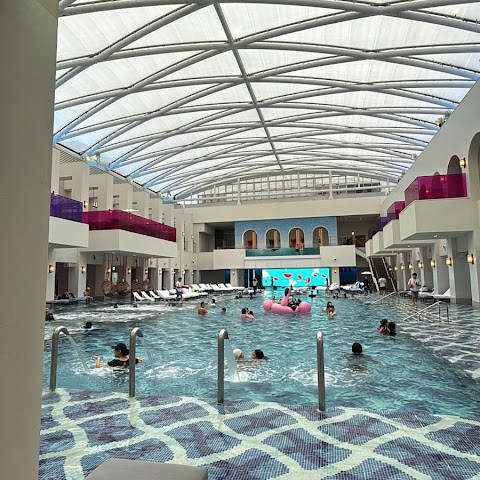 제일 크고 깊은 수영장에서 수영하기도 좋고 스파 느낌의 공간은 연인들에게 좋고 버추얼스파도 볼만하고 동굴스파도 좋아요 워터슬라이드도 있는데 어른들도 생각보다 좋아하시고요 옥상의 인피니티풀은 사람이 거의 없어서 호텔수영장보다 여유롭게 즐길 수 있습니다