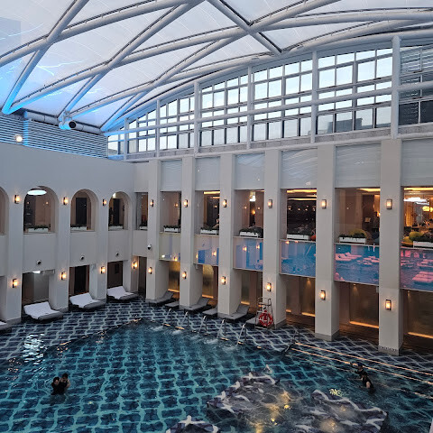 내부는 넓고 밝으며 매우 깨끗합니다. 평일에는 보통 붐비지 않습니다. 샤워 공간에는 스탠딩 샤워와 좌식 샤워가 모두 가능하며, 수영장에는 4단계의 수온과 마사지 기능이 있습니다. 수영복 건조 시설도 마련되어 있습니다. 수영장 이용권을 구매하시면 넓은 중앙 수영장을 이용하실 수 있습니다. 하지만 저는 찜질방 이용권만 있어서 찜질방 층에만 머물렀습니다. 공간은 꽤 넓었고, 찜질방 룸과 라운지 공간은 야외 공간, 수영장 공간, 그리고 소파가 있는 조용하고 한적한 공간 등 다양한 전망을 제공합니다. 헬스장과 레스토랑도 있습니다.