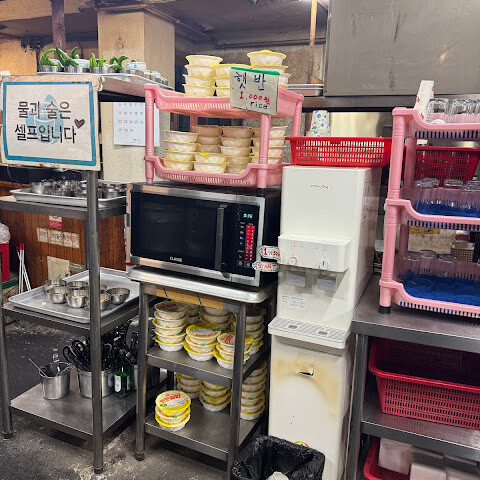 김치랑 술은 셀프 서비스고, 전자레인지용 밥도 있어요.