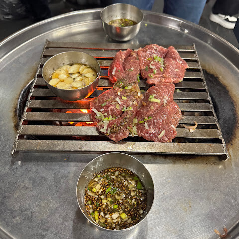 간단하고, 간단하며, 1000% 맛있는 음식입니다. 메뉴는 따로 없고, 인원수에 맞춰 소고기를 주문하거나 마음껏 드시면 됩니다. 각 그룹에는 바비큐 숯불구이가 제공되며, 원하는 대로 고기를 직접 구워 드실 수 있습니다. 양도 푸짐하고 고기 맛도 훌륭합니다. 피망, 고추장, 마늘을 곁들인 디핑소스도 함께 제공됩니다.