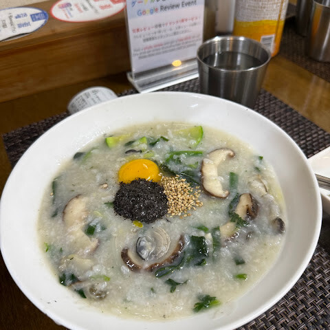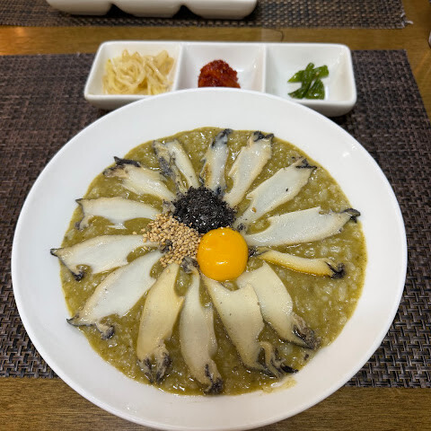 버섯 굴죽을 먹었는데 정말 맛있었어요! 계란 추가해서 드시면 훨씬 더 맛있답니다. :) 오징어 김치도 10점 만점에 10점이에요. 강력 추천합니다! 👌