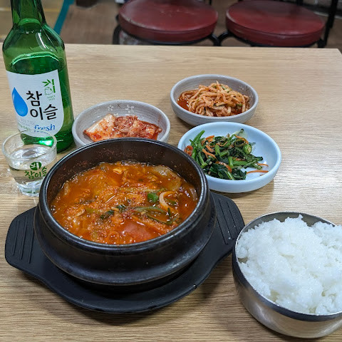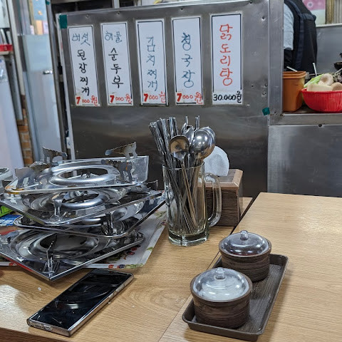 딸이랑 둘이 가서 청국장, 순두부, 감자전 먹었어요. 감자전은 주문하면 바로 강판에 갈아서 부쳐주시는데 엄청 쫀득쫀득 맛있어요. 앞에 통닭집에서 1차로 간단히 먹고 갔는데도 둘다 1인1공 다 해치울만큼 맛있었어요. 청국장은 냄새많이 안나고 칼칼하고 구수하고 순두부는 살짝 매콤한데 해물이 다양하게 들어가서 개운한 맛이에요.