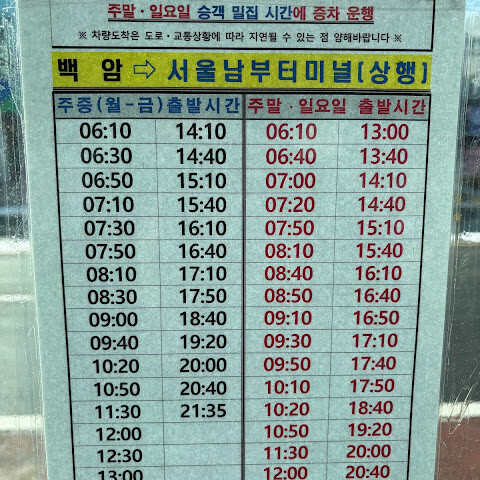 남부버스터미널에서 백암터미널까지 버스를 타고, 백암터미널에서 공원까지는 105번 버스를 탔습니다.