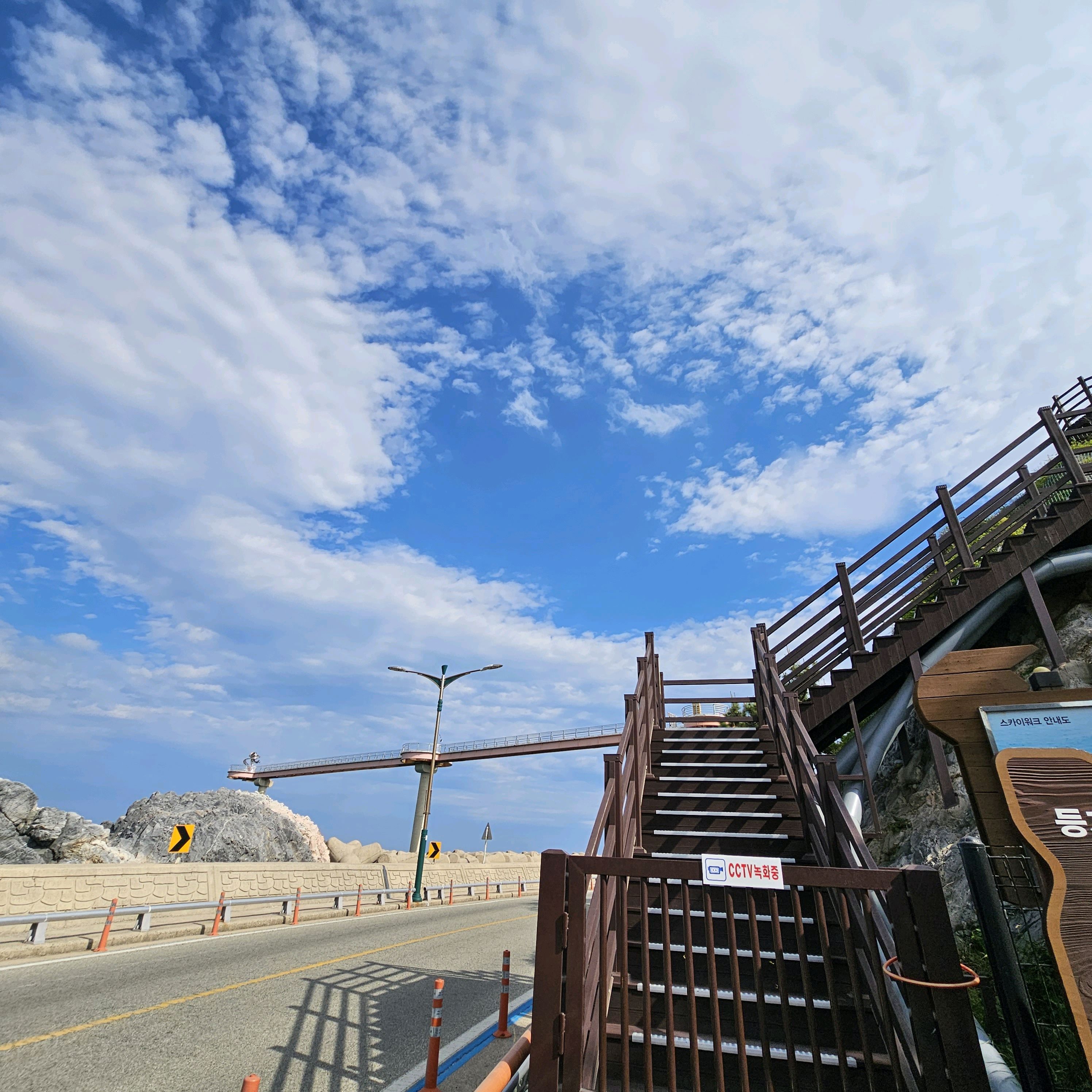 |  바닷가 쪽  계단은 안전상 막아둔것 같아요 아주 조금 돌아가는 주차장 쪽 계단으로 올라가면 덧신을 신고 유리바닥 으로 나갑니다 시원한 바다 바람과 동해안 해안선을 감상하는 아주 멋진 무료 뷰포인트입니다 뒷산과 연결된 조그만 공원이 아기자기 예뻐요 2024년 09월 14일 |