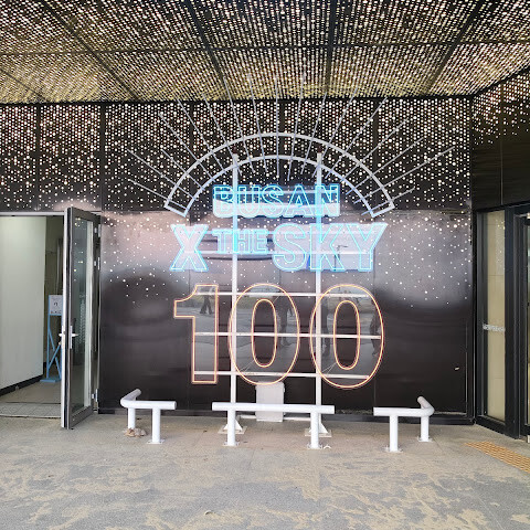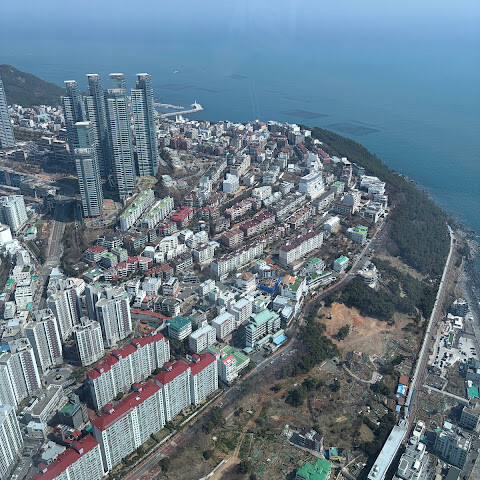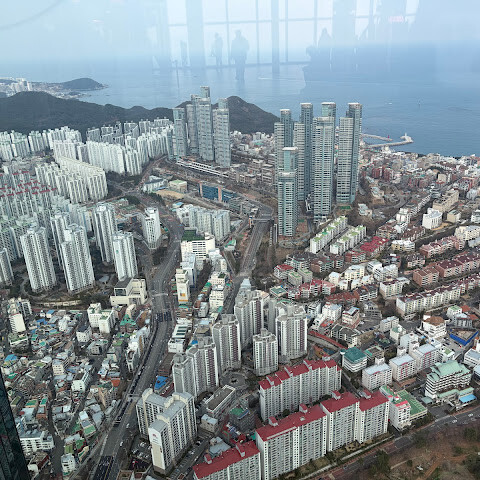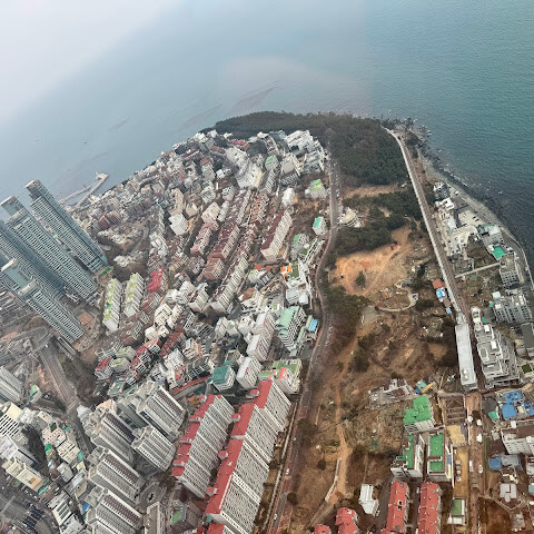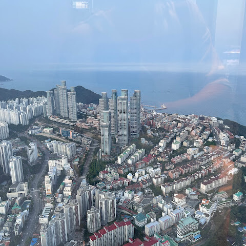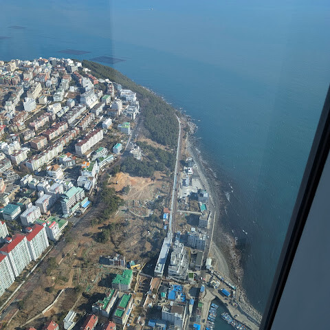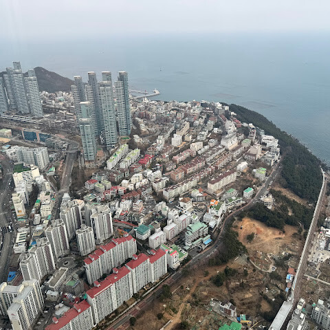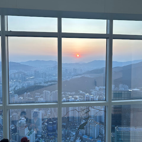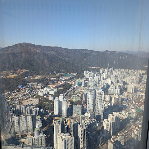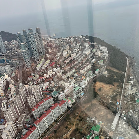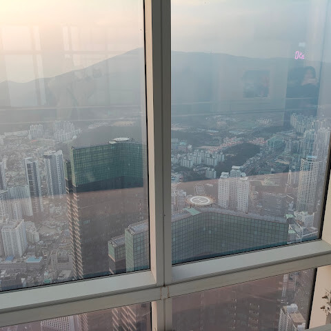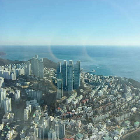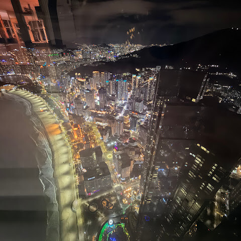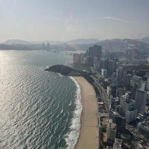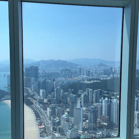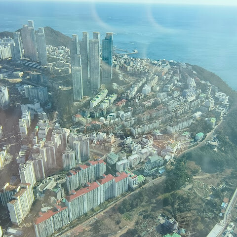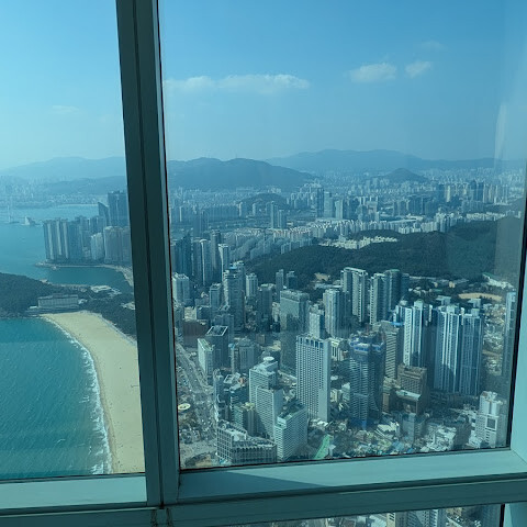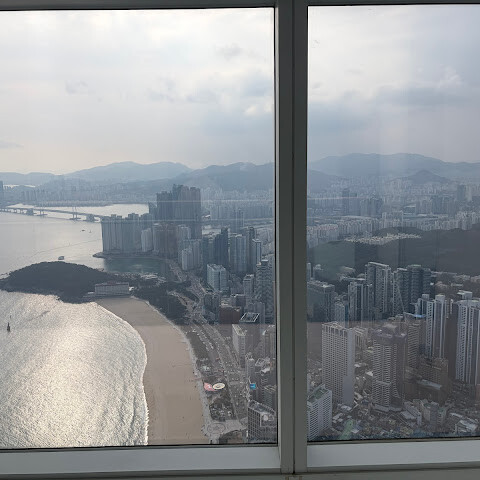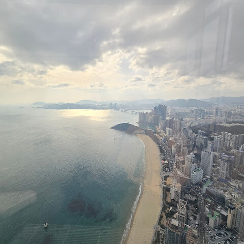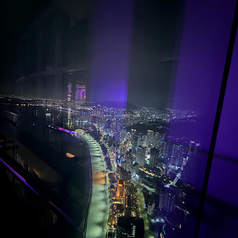 저희는 패스를 이용해서 여기까지 올라왔어요. 밤에 드론 비행을 보고 싶었는데, 여기서는 낮에만 경치를 볼 수 있더라고요. 그래도 낮에도 정말 아름다웠어요. 고층 건물들이 마치 비현실처럼 보였고, 모든 게 초현실적으로 느껴졌어요. 해안 관광이 이렇게 잘 발달한 게 정말 놀라웠어요. 시설도 훌륭했고요. 제일 높은 건물에는 스타벅스가 있더라고요. 100층에 올라간 후에는 해안 열차를 탔어요. 사람이 정말 많아서 모든 걸 다 볼 수는 없었어요. 여러 번 와야 다 볼 수 있을 것 같아요. 해운대 해변과 해안선, 그리고 새로 지어진 건물들을 감상하기에 정말 좋은 곳이에요!