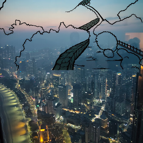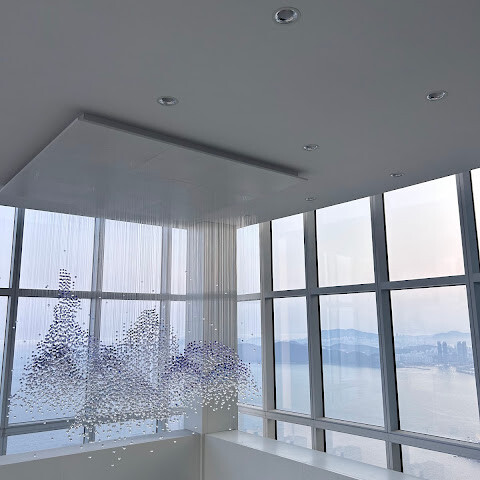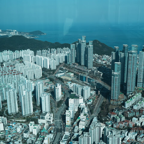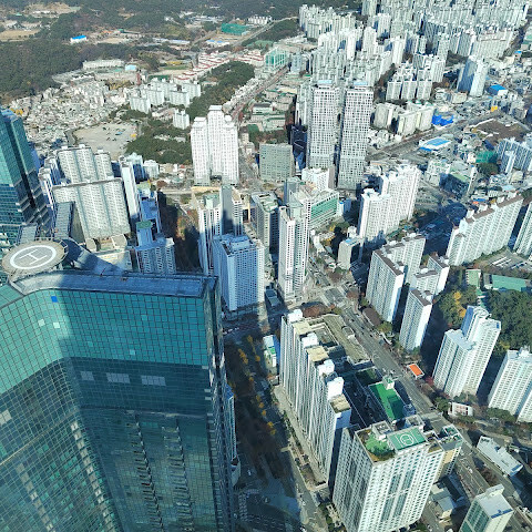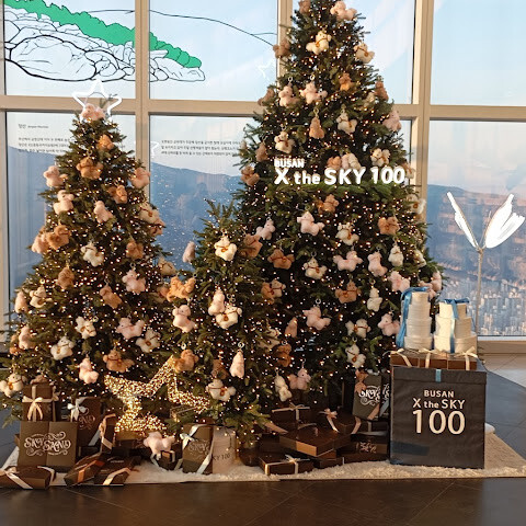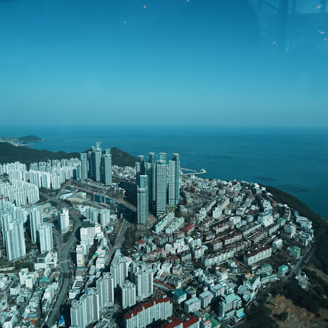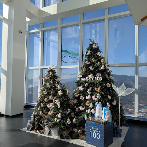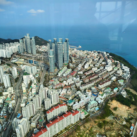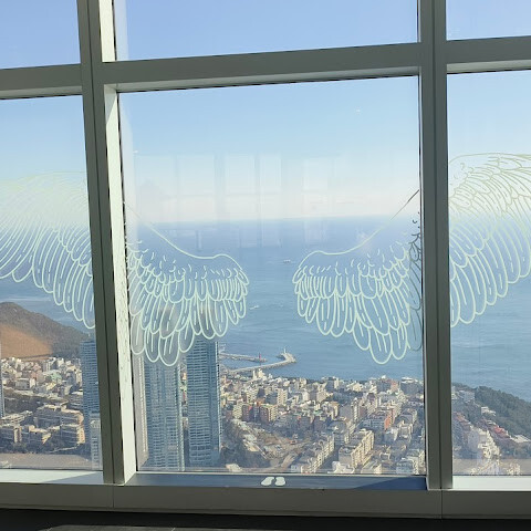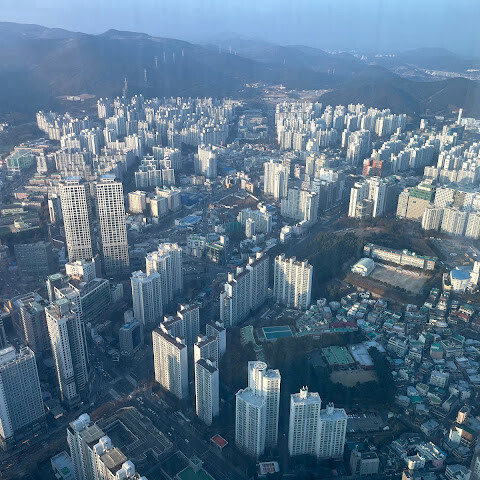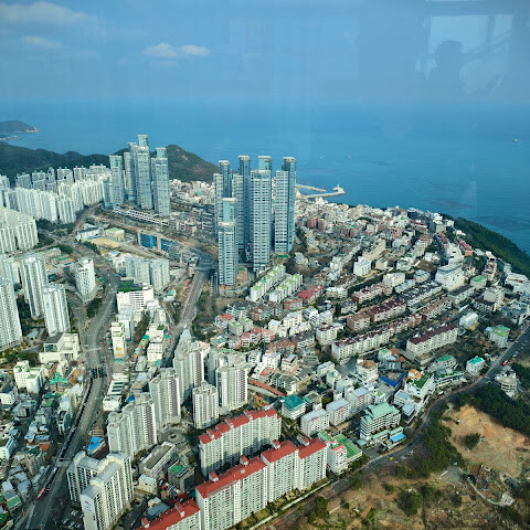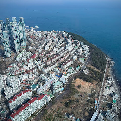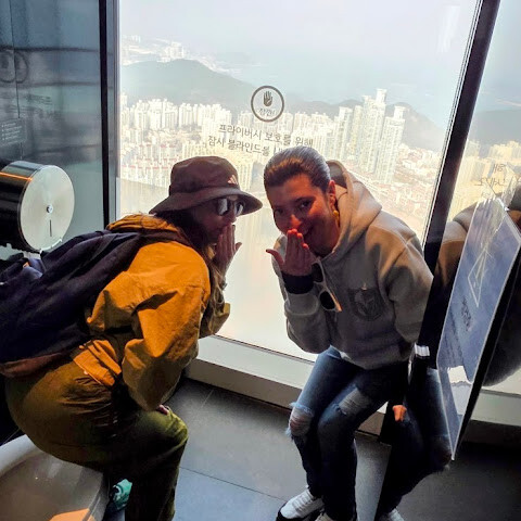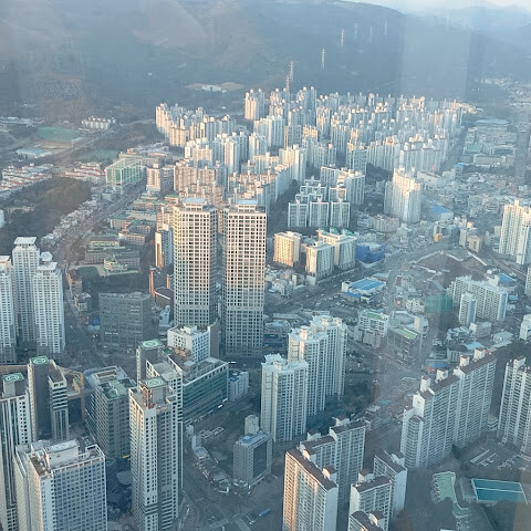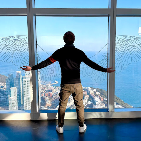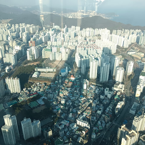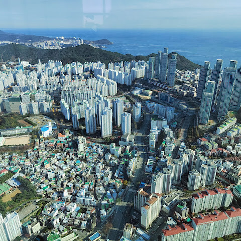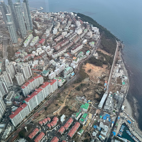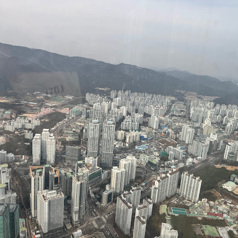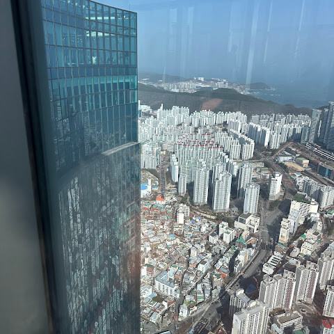저희는 패스를 이용해서 여기까지 올라왔어요. 밤에 드론 비행을 보고 싶었는데, 여기서는 낮에만 경치를 볼 수 있더라고요. 그래도 낮에도 정말 아름다웠어요. 고층 건물들이 마치 비현실처럼 보였고, 모든 게 초현실적으로 느껴졌어요. 해안 관광이 이렇게 잘 발달한 게 정말 놀라웠어요. 시설도 훌륭했고요. 제일 높은 건물에는 스타벅스가 있더라고요. 100층에 올라간 후에는 해안 열차를 탔어요. 사람이 정말 많아서 모든 걸 다 볼 수는 없었어요. 여러 번 와야 다 볼 수 있을 것 같아요. 해운대 해변과 해안선, 그리고 새로 지어진 건물들을 감상하기에 정말 좋은 곳이에요!