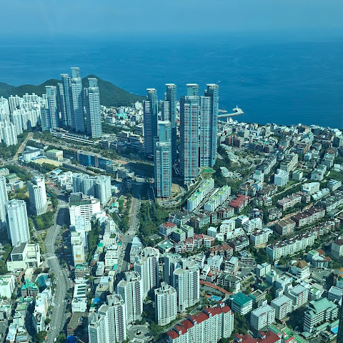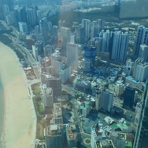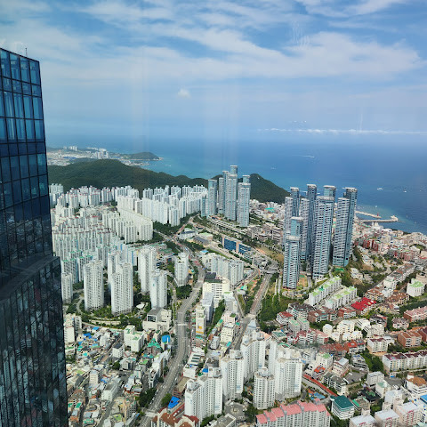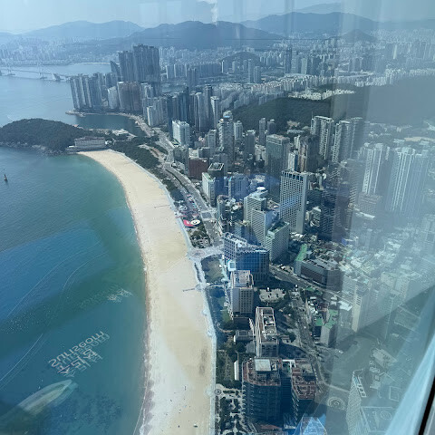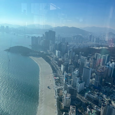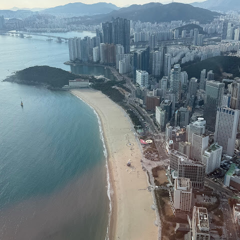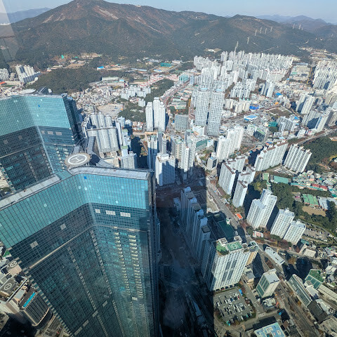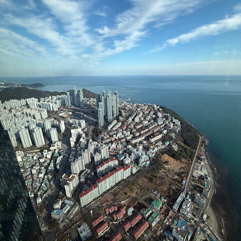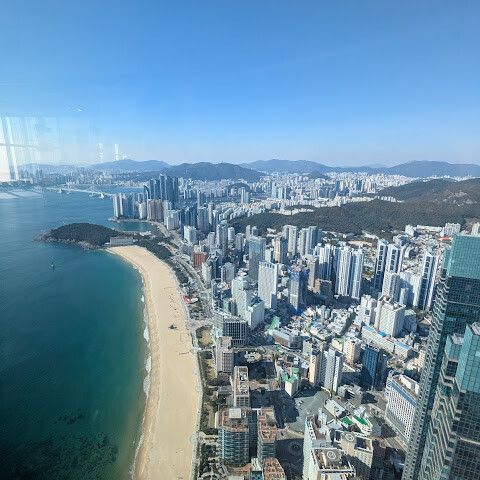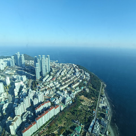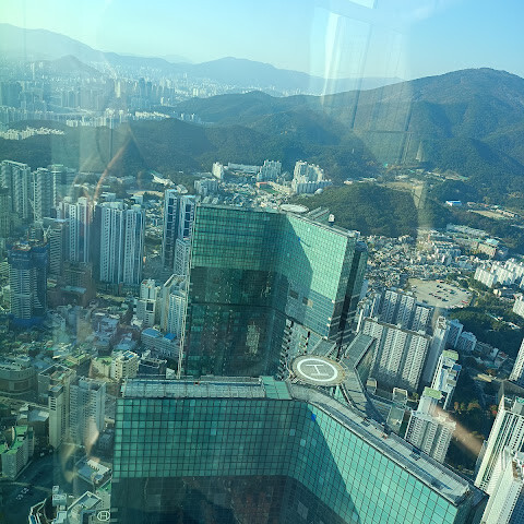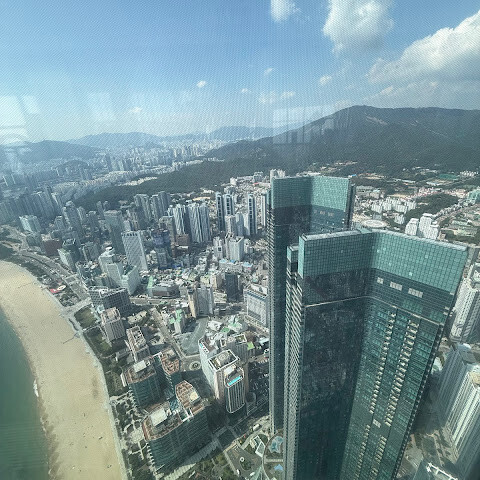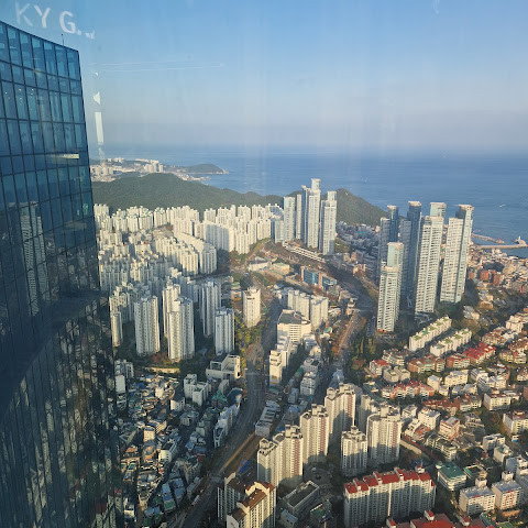 해운대 해변 동쪽 끝에 위치한 이 세 고층 건물 중 가장 높은 건물에서는 도시 전체를 아우르는 상당히 넓은 전망을 감상할 수 있습니다.