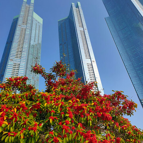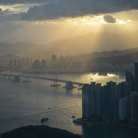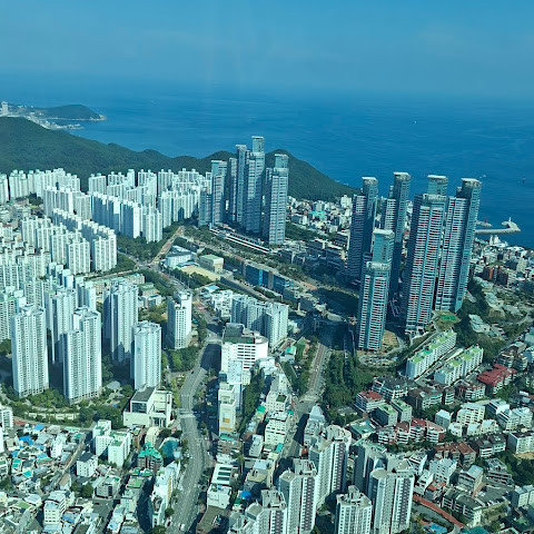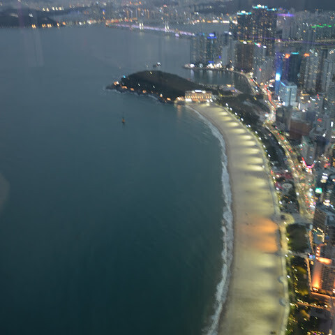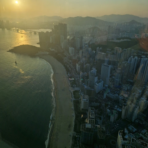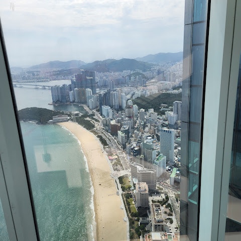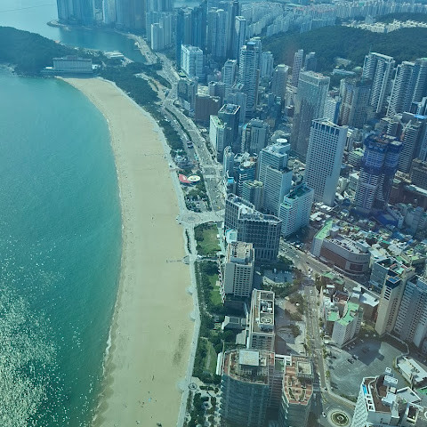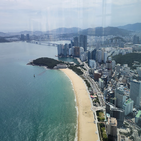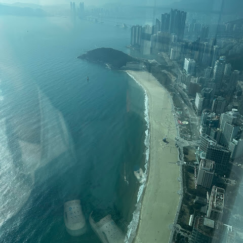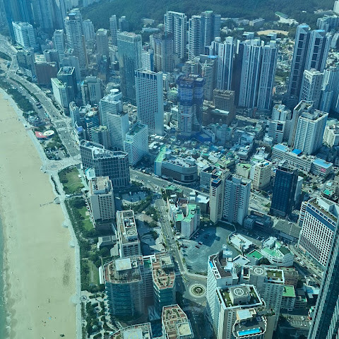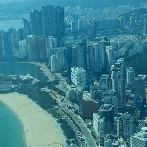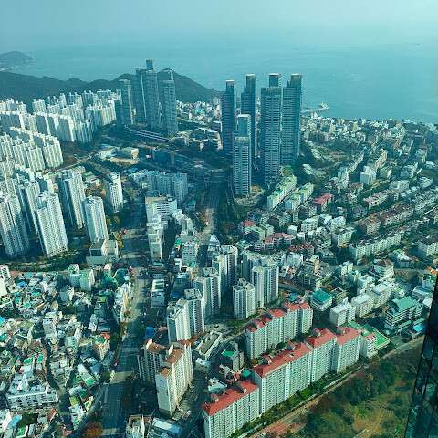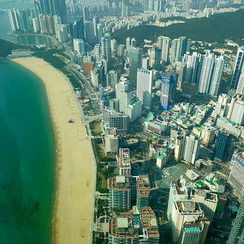 해운대 해변 동쪽 끝에 위치한 이 세 고층 건물 중 가장 높은 건물에서는 도시 전체를 아우르는 상당히 넓은 전망을 감상할 수 있습니다.
