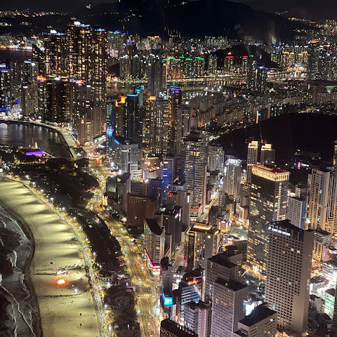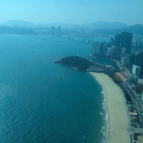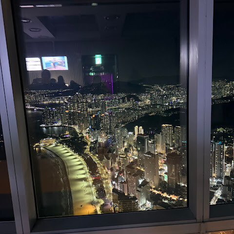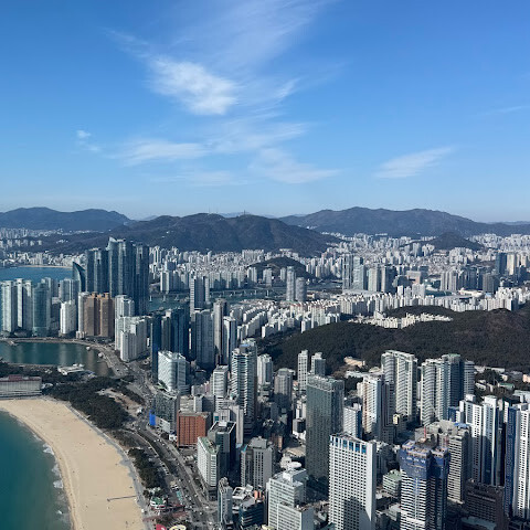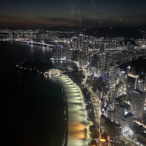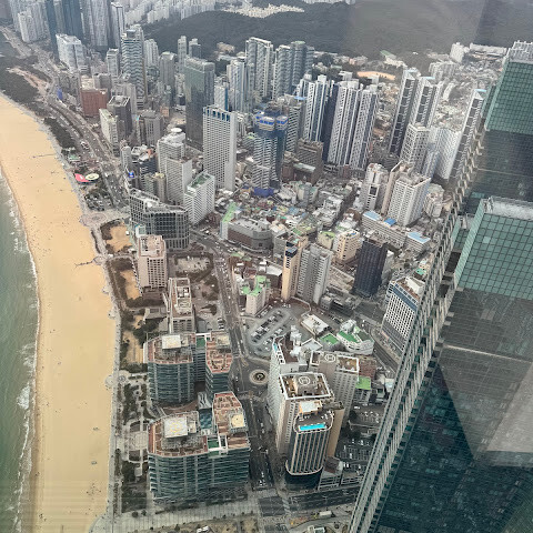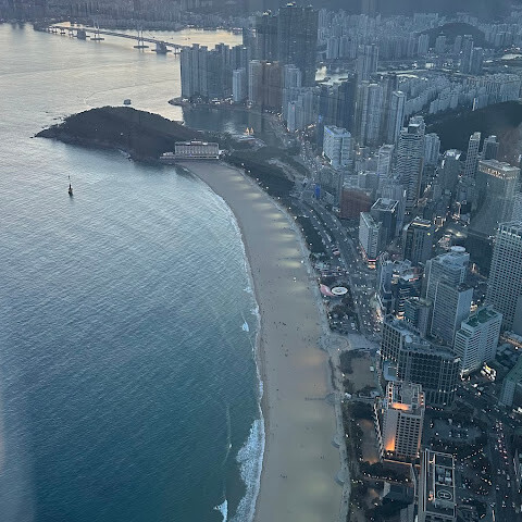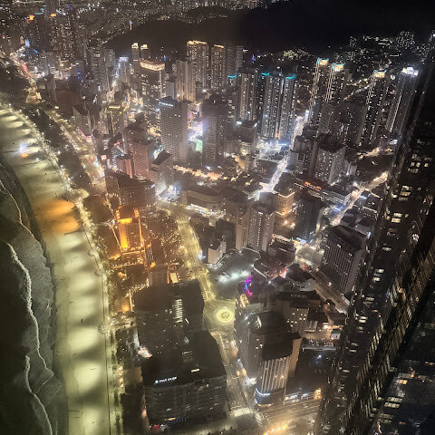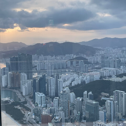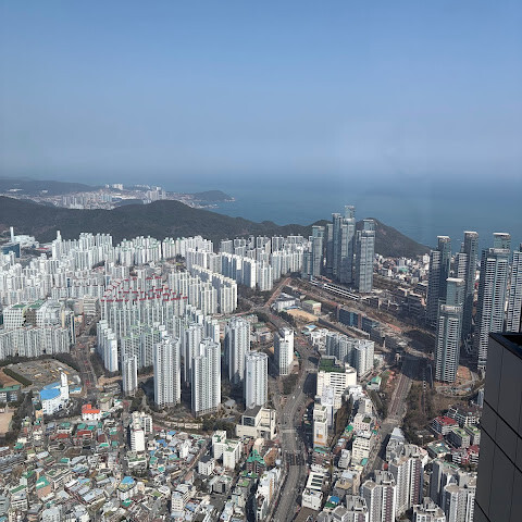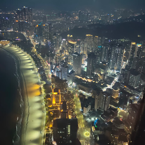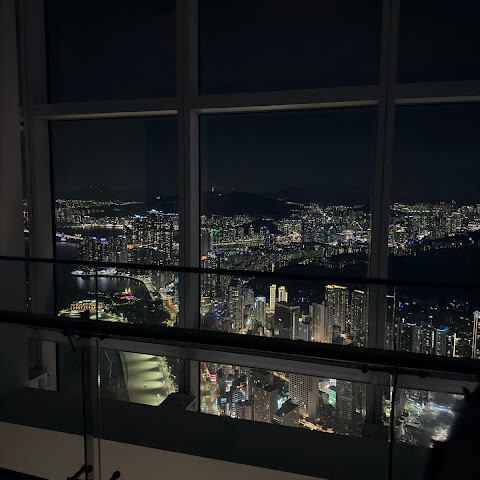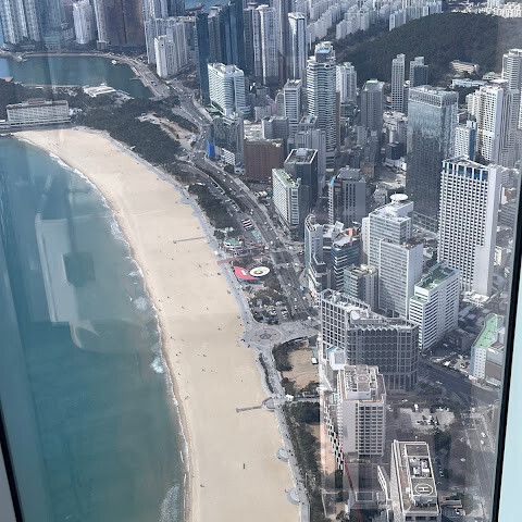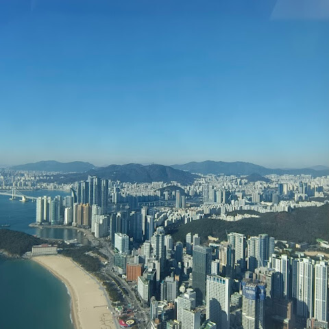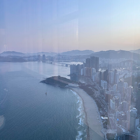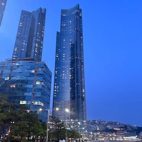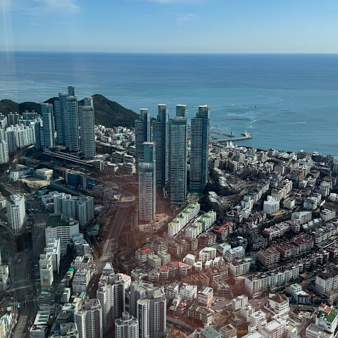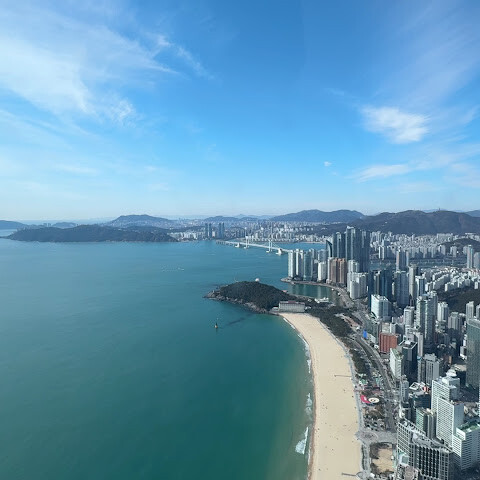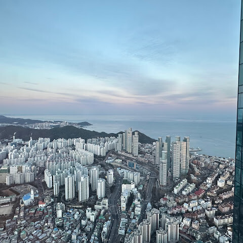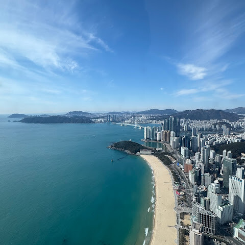 저희는 패스를 이용해서 여기까지 왔어요. 밤에 드론 비행을 보고 싶었는데, 여기는 낮에만 경치를 볼 수 있더라고요. 그래도 낮에도 정말 아름다웠어요. 고층 건물들이 마치 비현실적으로 보일 정도였고, 해안 관광이 얼마나 잘 발달했는지 놀라웠어요. 시설도 훌륭했고요. 가장 높은 건물에는 스타벅스가 있었고, 100층에 올라간 후에는 해안 열차를 탔어요. 사람이 정말 많아서 모든 걸 다 볼 수는 없었어요. 모든 걸 다 보려면 여러 번 와야 할 것 같아요. 해운대 해변과 해안선, 그리고 새로 지어진 건물들을 구경하기에 정말 좋은 곳이에요!