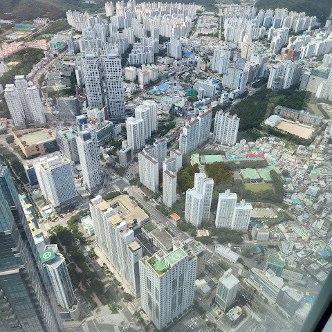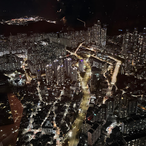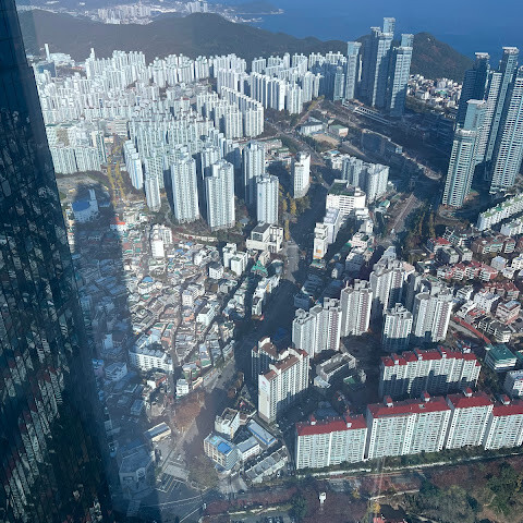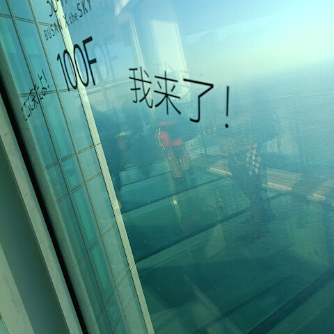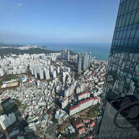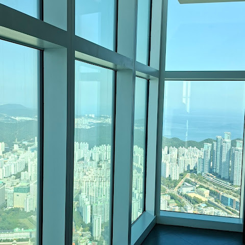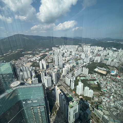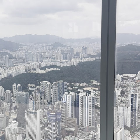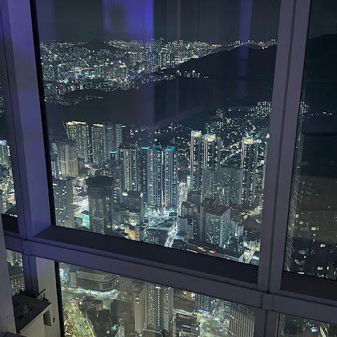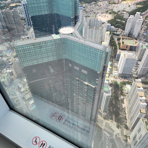 98~100층에서 부산의 일부를 바라봅니다. 360도는 안 보여요. 유리가 반사되기도 해서 아래 풍경을 배경으로 사진 찍기에는 적합하지 않아요. (Intinyi hilih mihil imit)