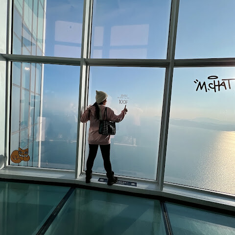 제가 갔을 시간대는 바다를 배경으로 해서 찍기에는 역광이였고, 98층인가? 한층 내려오면 오른쪽에 작게 포토존이 있는데 거기서 사진 많이 찍었어요! 사람도 많이 없어서 편하게 찍기도 좋았어요!