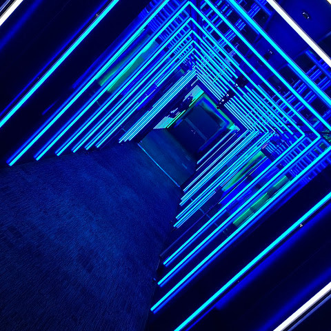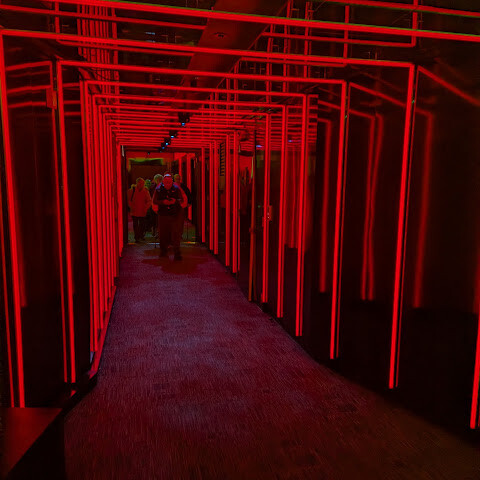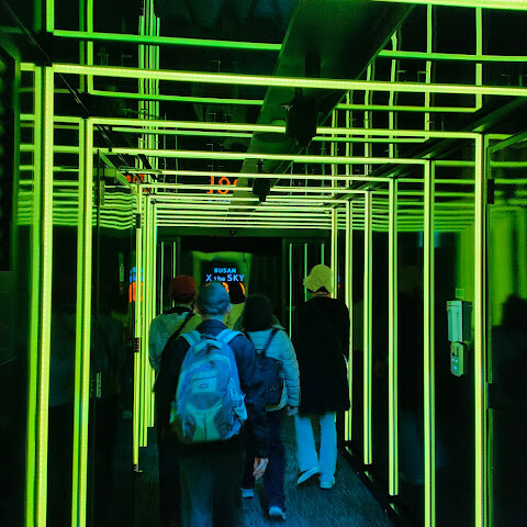 100층에 도착하면 엘리베이터 문이 열리고 눈부신 네온 터널이 나타납니다.