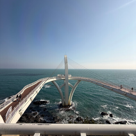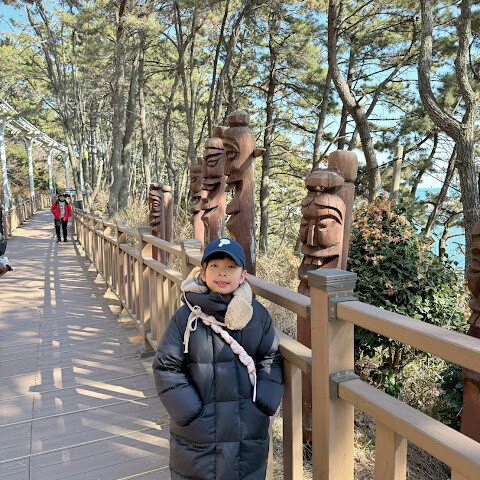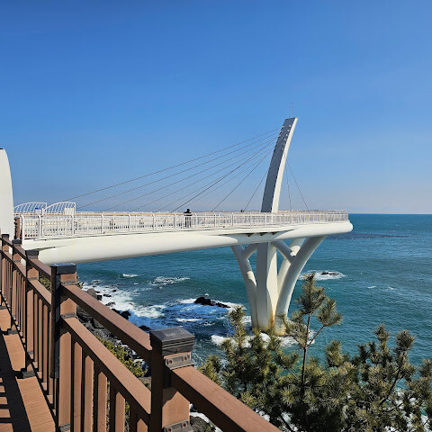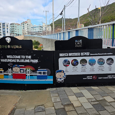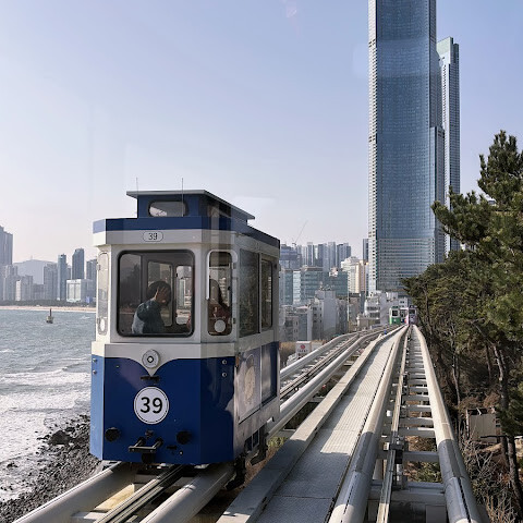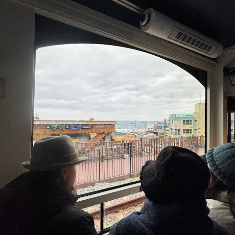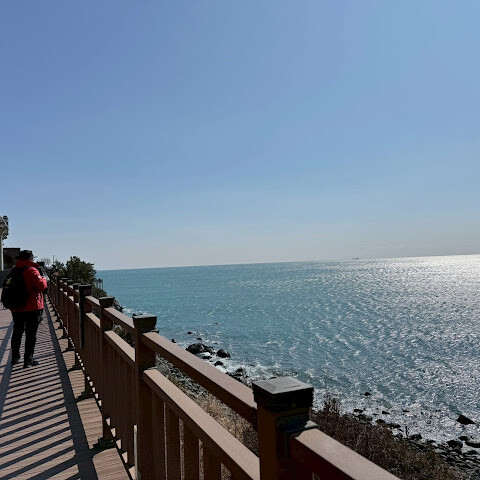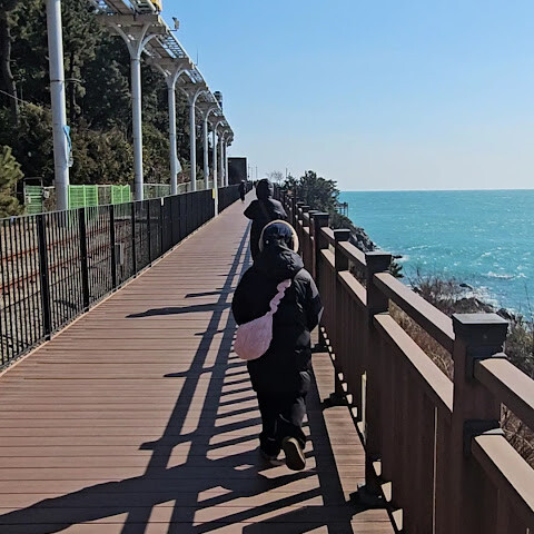 지난번 부산 여행 때는 캡슐 열차를 탔었는데, 이번에는 해안 열차를 타보고 싶었어요. 하지만 미리 표를 사지 못해서 오후에 현장에서 사야 했죠. 지난번에 캡슐 열차를 탔을 때는 해안 산책로를 따라 조깅하거나 산책하는 현지인들을 많이 봤는데, 이번에는 표를 구할 수 없어서 직접 걸어보기로 했어요. 겨울 날씨와 따스한 햇살 덕분에 너무 덥지도 춥지도 않고 산책로를 걷기에 아주 좋았어요. (부산 해운대에 있는 블루라인 공원은 옛 동해남선 철도를 개조해서 만든 잘 관리된 해안 산책로를 자랑해요. 길이는 약 4.8km로 미포역, 청사포역, 송정역을 연결해요. 해안 열차나 캡슐 열차를 타고 산책로를 따라 걸을 수도 있고, 도중에 무료로 개방된 청사포 스텝스톤 전망대와 최근에 개장한 해월 전망대에 들러 아름다운 바다 풍경과 어촌 마을의 정취를 만끽할 수 있어요.) 한번 가보세요!